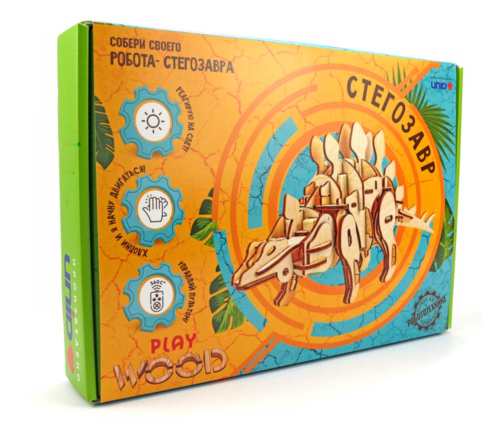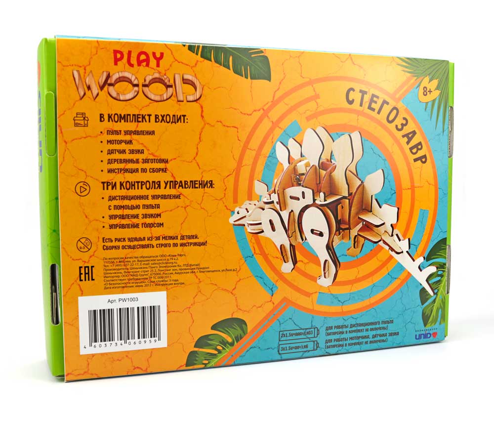 СТЕГОЗАВР PLAYWOOD, размер 36.610.418.2мм. 8+. 3 способа управления: пультом, звуком, светом. Динозавр может ходить и бегать, вращать головой, рычать и атаковать. Все детали легко и надежно крепятся друг к другу, выполнены из экологически чистой древесины.