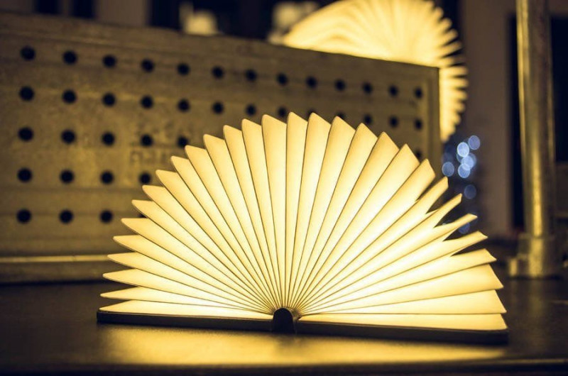 Внешне светильник ничем не отличается от книги в твердом переплете. Если поставить аксессуар на полку с книгами, никто и не догадается, что это источник света.