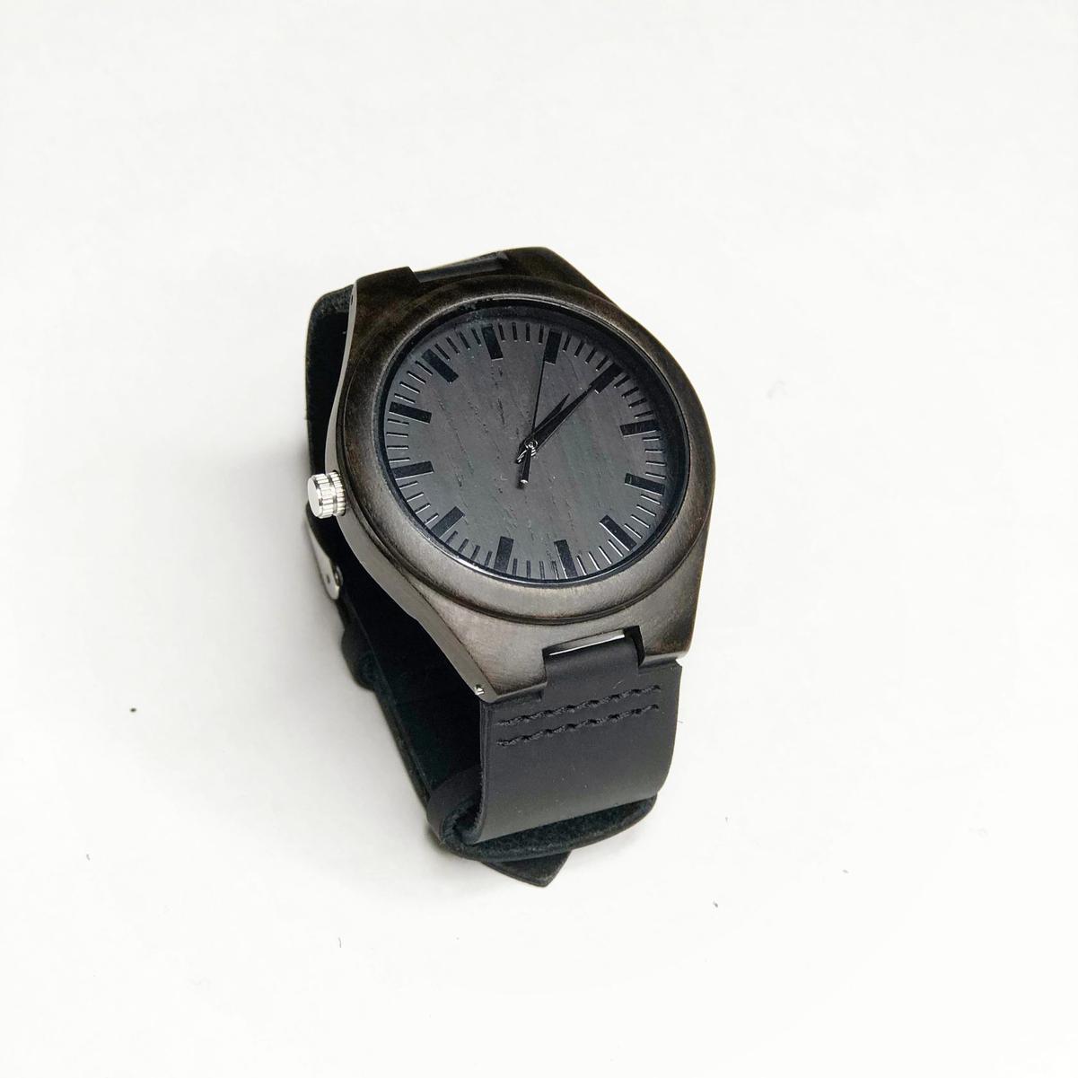 Идти вперёд и не останавливайся на достигнутом. Мужские часы «ДЕЙСТВУЙ», кейс и циферблат которых сделаны из эбенового дерева, ремешок из чёрной кожи. Для самых сильных и стойких. Диаметр циферблата — 49 мм. Длина ремешка — 215 мм. Используется кварцевый японский механизм Miyota 2035.