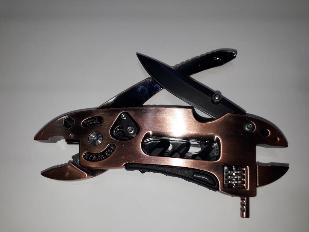 Очень компактный и полезный интрумент, который всегда выручит вас в подходящий момент. В состав инструментов входит: нож, набор трех отверток, плоскогубцы, небольшой разводной ключ, Фиксируется к одежде или рюкзаку при помощи специального зажима. Материал: нержавеющая сталь с медным покрытием.