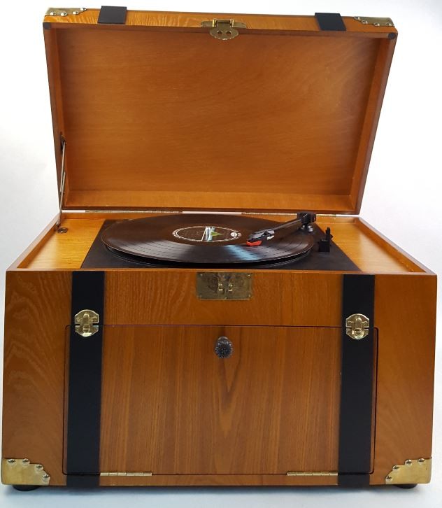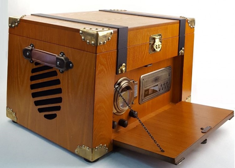 Невероятно яркий дизайн в стиле ретро, музыкальный центр выполнен в виде оригинального сундука с откидной передней крышкой, за которой скрывается панель с аналоговым радио тюнером и CD-проигрыватель. Тюнер имеет радиальную шкалу, которая оснащена диодной подсветкой. Сундук имеет богатый облик, отделан шпоном из натурального дуба, с декором из латуни. Под крышкой сверху располагается проигрыватель пластинок с надежным пьезо звукоснимателем, обеспечивающий глубокий мощный звук. Станет изящным и практичным предметом в интерьере или замечательным оригинальным подарком для ценителей.