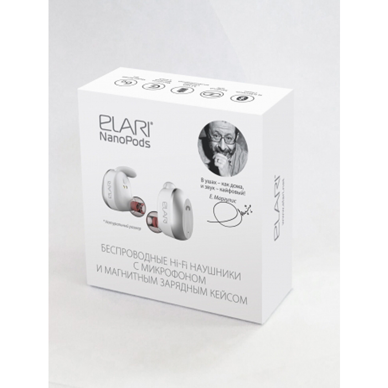 Новый уровень комфорта для любителей хорошего звука. Соединившись один раз по Bluetooth, NanoPods будут автоматически повторно подключаться к смартфону/плееру. Они практически не ощущаются и при этом крепко держатся в ушах, используя в конструкции анатомию ушной раковины. Слушайте музыку до 3,5 часов или общайтесь через телефон/мессенджер до 4,5 часов без подзарядки, управляя треками и вызовами одной кнопкой. Элегантный магнитный кейс-аккумулятор надежно сохранит и быстро подзарядит Ваши Elari NanoPods, чтобы их прекрасный объёмный звук радовал Вас так же, как радует легендарного музыканта и ведущего «Квартирника» на НТВ Евгения Маргулиса!