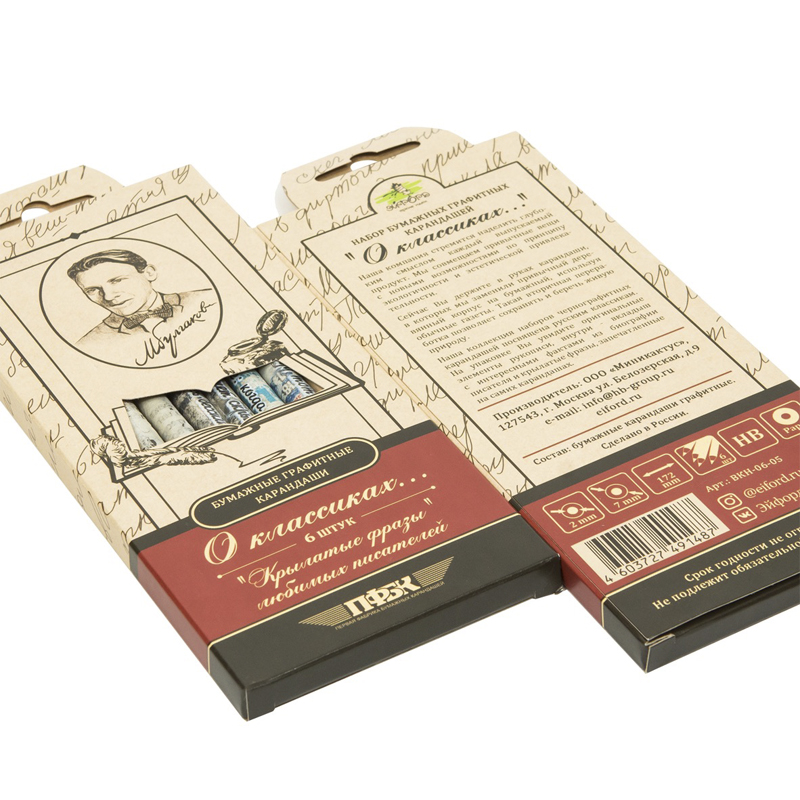 Взяв в руки упаковку, Вы сможете увидеть, как выглядят оригинальные рукописи писателя. Внутри Вас ждет вкладыш с интересными фактами из его биографии и крылатые фразы на самих карандашах о вечных ценностях жизни.