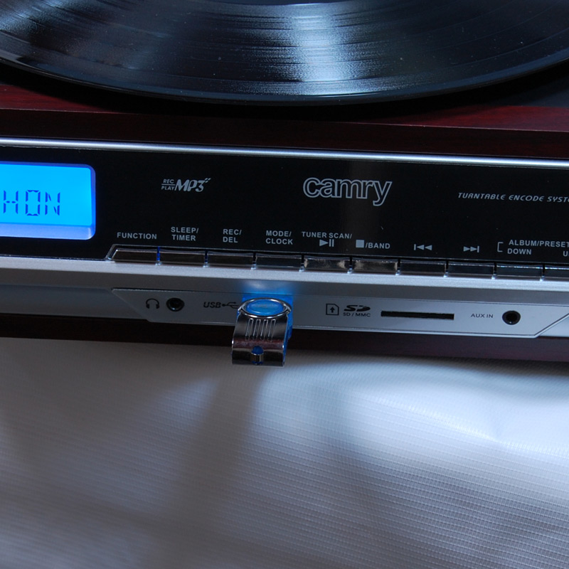 Camry CR1114 — качественный и недорогой проигрыватель виниловых дисков с usb-портом для флешек, на которые можно записывать понравившиеся мелодии с пластинок или радио. Также имеется слот для SD-карт. Для удобства, проигрыватель имеет встроенные динамики. Их мощности вполне достаточно, чтобы наслаждаться музыкой в небольшом помещении.