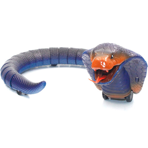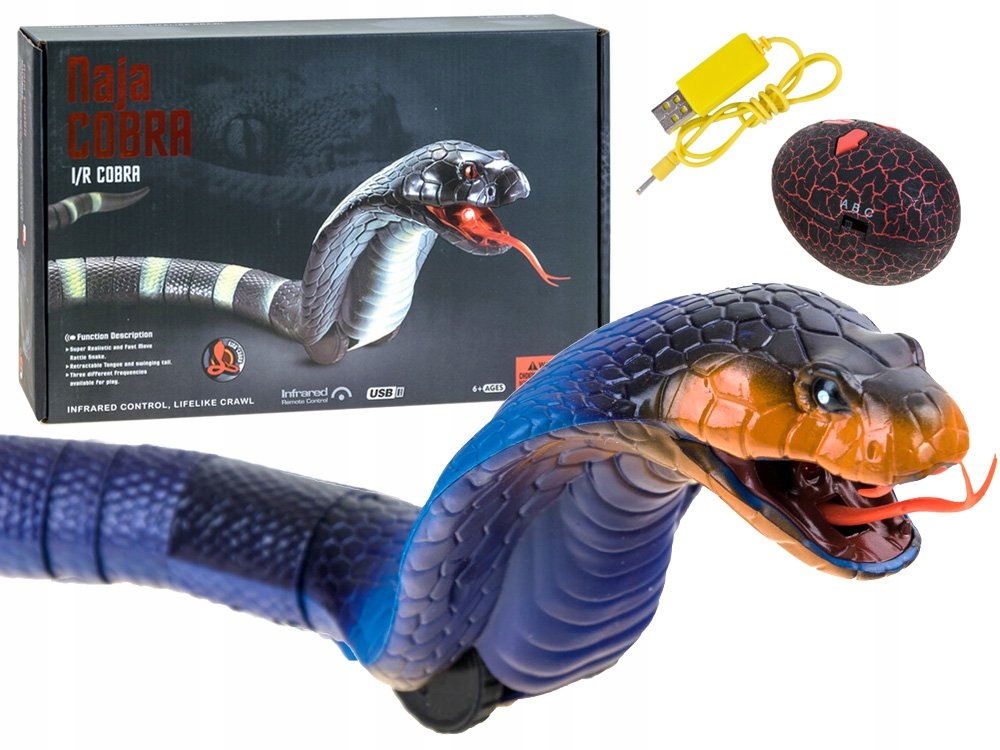 Очень реалистичная кобра на пульте управления. При движении извивается как самая настоящая змея. Имеет яркий насыщенный цвет. Если вы желаете кого-нибудь разыграть то данная игрушка станет отличным решением. Радиоуправляемая змея-кобра работает от встроенного аккумулятора, заряжается по USB. Движение: вперед, влево/вправо; Очень реалистична; Тип управления: радиоуправление; Доступные цвета: черный, синий; Особенности: реалистичные движения, высовывает язык; Питание: аккумулятор в кобру (встроенный), батарейки-таблетки в пульт; Радиус действия: 15 м; Время зарядки: 30 мин.; Время работы: 20 мин.; Длина кобры: 40 см.;