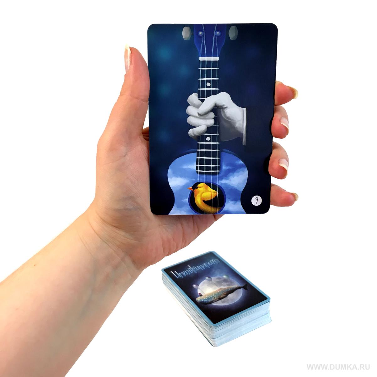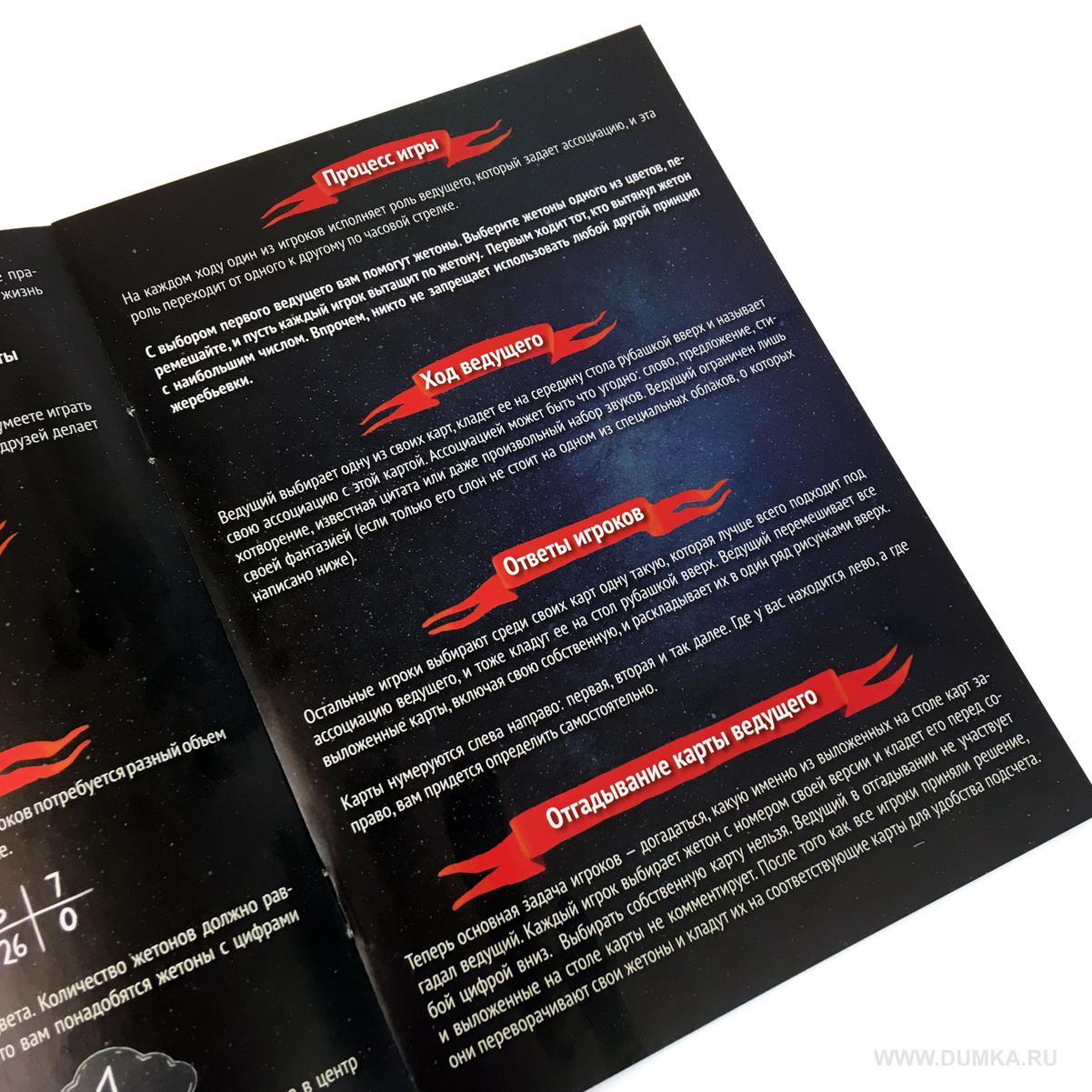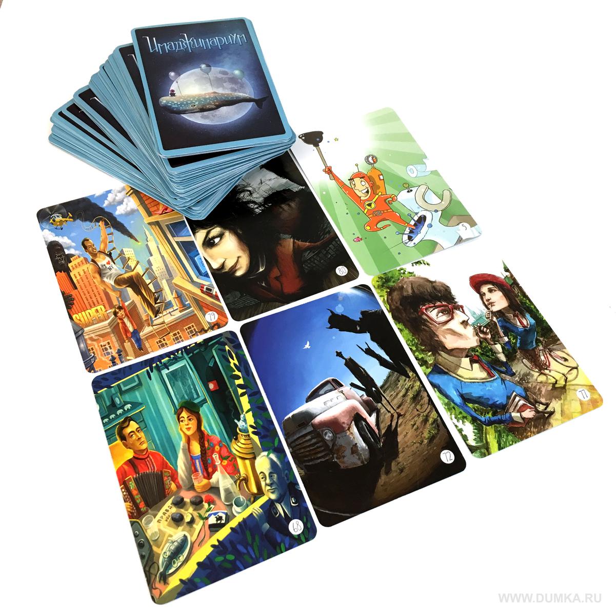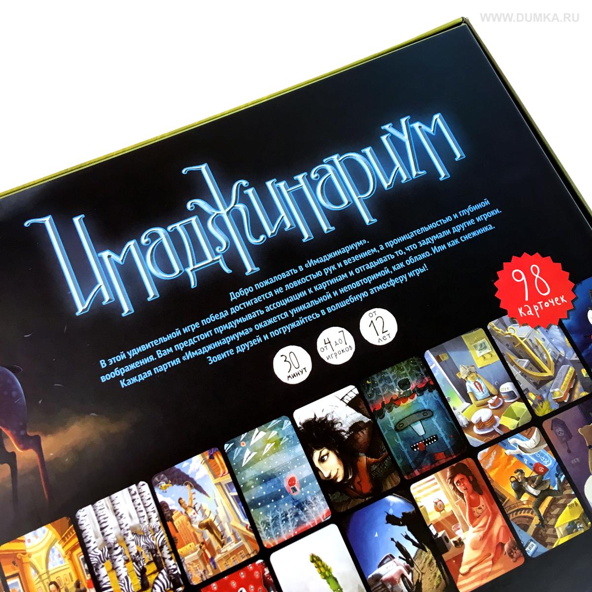 Что это такое? «Имаджинариум» — удивительная настольная игра, не похожая ни на одну другую. В наборе огромное количество карточек с самыми невообразимыми рисунками, на которых словно бы запечатлены чьи-то фантастические сны. Вам предстоит подобрать к карточкам ассоциации —, но не думайте, что все так просто! Необходимо так описать карточку, чтобы ее угадало как можно больше людей, но ни в коем случае не все. Ассоциация не должна быть слишком очевидной и банальной. Придется напрячь воображение и сочинить завуалированное описание, способное запутать людей, но не сбить их с толку. Звучит сложно, но на деле это очень увлекательный процесс. Начав играть, Вы поймете, как это делается, и научитесь по-новому смотреть на привычные вещи. Вместе веселей! Эта парадоксальная игра — любимчик на вечеринках и семейных праздниках. Она подарит несколько часов веселого общения и позволит узнать больше о товарищах по игре, посмотреть на мир их глазами. С «Имаджинариумом» Вы научитесь разгадывать задумки других людей и понимать их с полуслова. Но самое ценное — это добрые и хорошие впечатления, которые Вы получите, проведя вечер с друзьями и родными за этой веселой игрой. И слоны... Крылатые слоны! Фишки в игре — это очаровательные крылатые слоны, которые будут перемещаться с облачка на облачко по игровому полю. Разве может игра быть еще прекрасней? Что входит в набор? Игровое поле 98 карт ассоциаций 7 фишек слонов 42 жетона голосований Правила игры