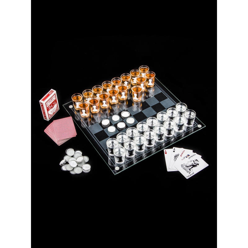Выпей победу до дна! Уже известный постоянным покупателям набор шахмат со стопками теперь стал более универсальным. В него дополнительно входят стеклянные шашки (прозрачные и матовые, диаметр 2 см) и набор карт для покера 90х65 мм. Есть удобная ручка для переноски. Досуг с таким набором станет, как минимум, в три раза веселей! Материал: Шахматы и шашки изготовлены из стекла, карты из ламинированного картона. Упаковка: Набор упакован в пенопластовый ложемент и фирменную картонную коробку. Размер подарочной упаковки:65400400 мм. Размер игрового поля 350х350 мм. Размер стопки:473737 мм. Полезный объём стопки: 25 мл. Вес брутто: 2,850 кг. Вес нетто: 2,800 кг.