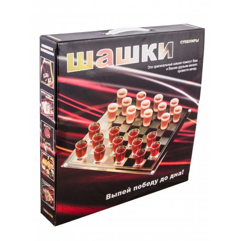 Выпей победу до дна! В серии игр со стопками — новичок — стеклянные шашки! Размер стеклянного игрового поля 35х35см, 12 матовых и 12 прозрачных стопок.