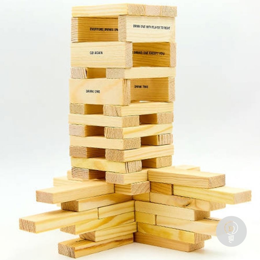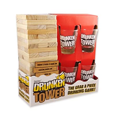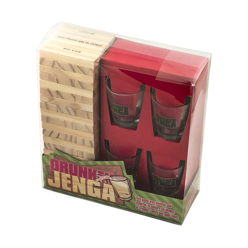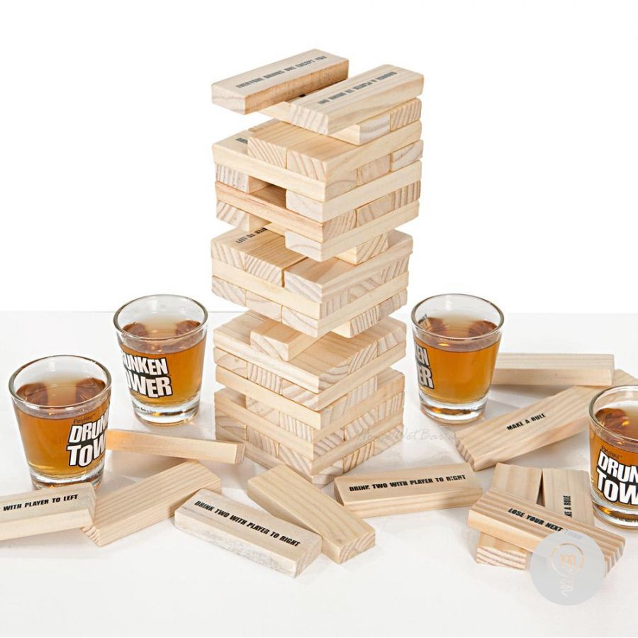 Популярная игра Дженга теперь снабжена стопками и даёт возможность проигравшему компенсировать свою неудачу рюмкой бодрящего напитка. Правила игры просты. На первом этапе из брусков строится башня (в каждом уровне 3 бруска, на каждый следующий уровень бруски кладутся перпендикулярно предыдущему). Далее игроки по очереди вытаскивают бруски из основания башни и кладут их сверху, делая башню всё более высокой и все менее устойчивой. Можно предварительно проверять бруски на устойчивость положения, так же можно передумать и оставить на месте уже слегка вытащенные бруски. Касаться башни при этом разрешается только одной какой-либо рукой. Проигравшим считается тот, чей ход обрушит башню. Ему и наливают штрафную.
