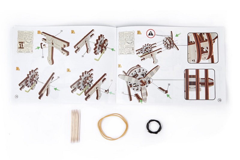 Модель самолета «Биплан» собирается без клея или каких-либо специальных инструментов. Готовое изделие можно активизировать, накрутив фиксирующую резинку на колесиках или пропеллере, а затем привести самолет в движение поворотом штурвала. Открытый моторный механизм будет постепенно раскручиваться, обеспечивая модели динамичное ускорение.