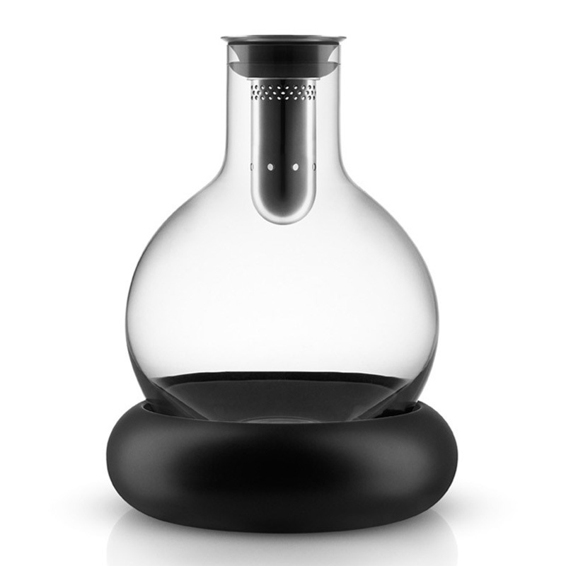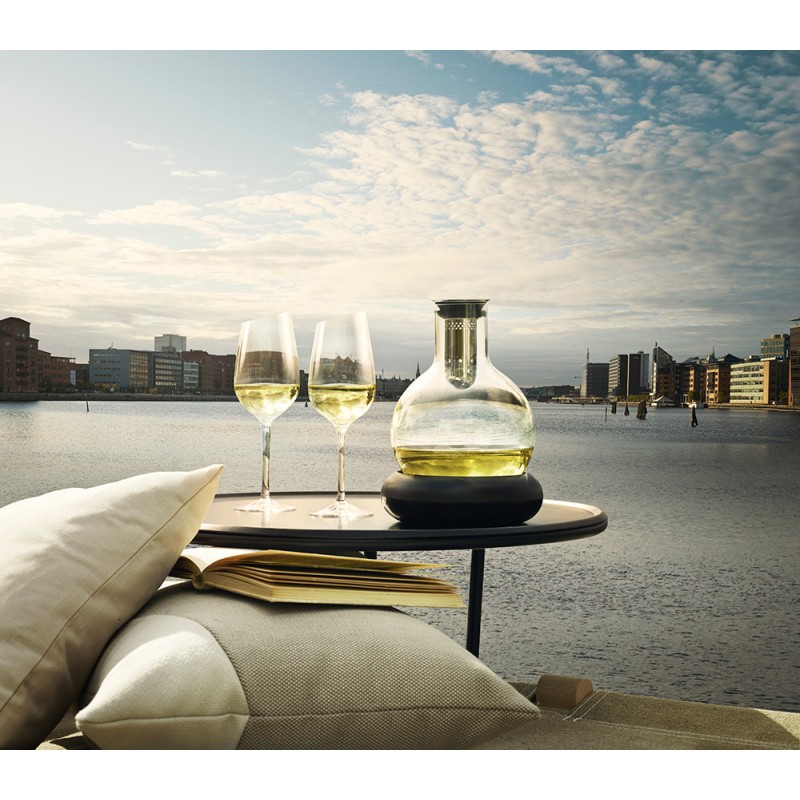 Графин-декантер, который выявит лучшие качества в выбранном вами вине. При наливании вино проходит через внутреннюю воронку со множеством дырочек, а затем стекает по стенкам, что позволяет ему максимально обогатиться кислородом. Этот процесс одновременно раскрывает вкус вина и делает его подачу исключительно эффектным. Помимо этого, когда вы будете наливать вино в бокал, ни капли не прольётся мимо — специальная форма горлышка не позволяет каплям падать с него, вместо этого направляя их обратно в графин. Новая версия дополнена удобной подставкой. Подержите ее в морозильнике перед подачей вина: напиток будет мягко охлаждаться на протяжении целых 4 часов. Графин изготовлен из стекла ручной работы. Вмещает 0,75 л. Можно мыть в посудомоечной машине.