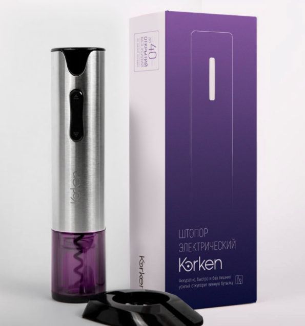 Стильный электрический штопор Korken NEON изготовлен из нержавеющей стали, обладая лаконичным стильным дизайном, ему всегда найдётся место на любой кухне! В корпус устройства интегрирован надежный порт зарядки для Micro USB. Korken NEON способен открыть 45−60 бутылок при полной зарядке. Электрический штопор Korken справится с любым видом пробок всего за 8 секунд! Легкий, компактный, стильный, невероятно удобный в применении, он всегда готов стать незаменимым помощником на любом мероприятии. KORKEN — лучший подарок для настоящих ценителей вина (культуры вина, винной индустрии.