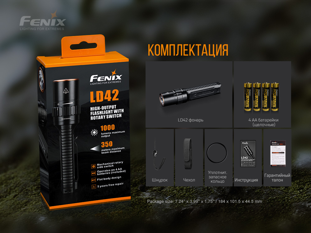 Фонарь Fenix LD42 — это компактная ручная модель с хорошим набором рабочих режимов и максимальной яркостью освещения 1000 люмен. В фонарь интегрирован всего один светодиод, поддерживающий 5 режимов освещения: