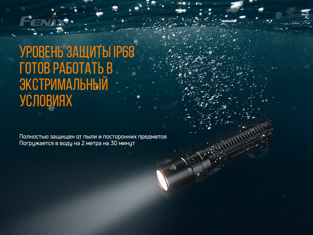 фонарь поддерживает яркость до 1000 люмен количество доступных режимов — 5 дальность луча — до 350 м фонарь работает с 4 батарейками АА время автономной работы — до 130 ч 20 мин механическое поворотное кольцо для управления головная часть корпуса сделана из алюминия хвост фонаря изготовлен из пластика влагозащищенность этой модели соответствует стандарту IP-68 в комплекте с фонарем продаются все нужные аксессуары.