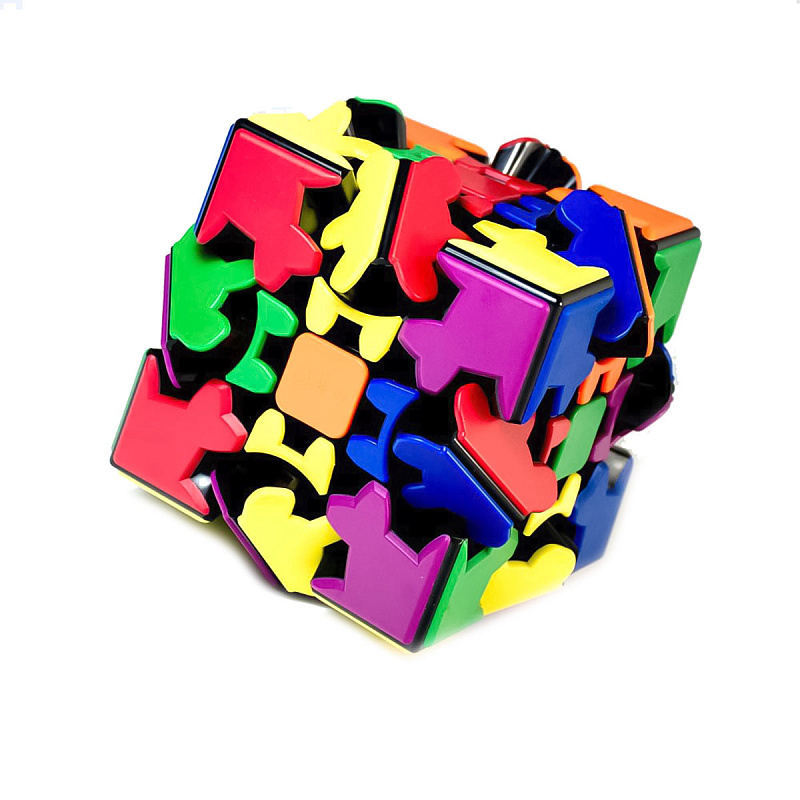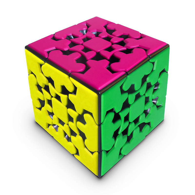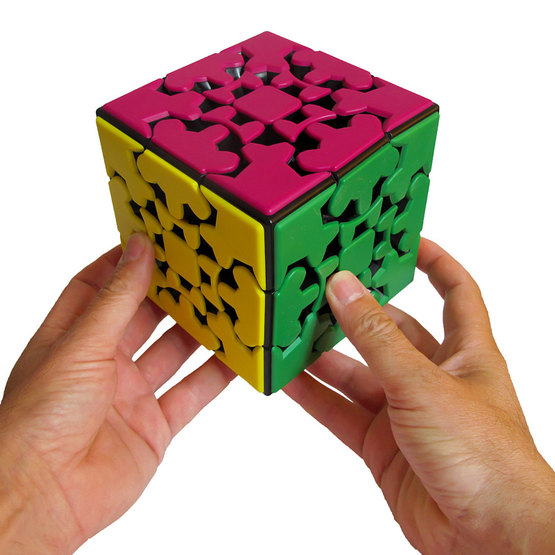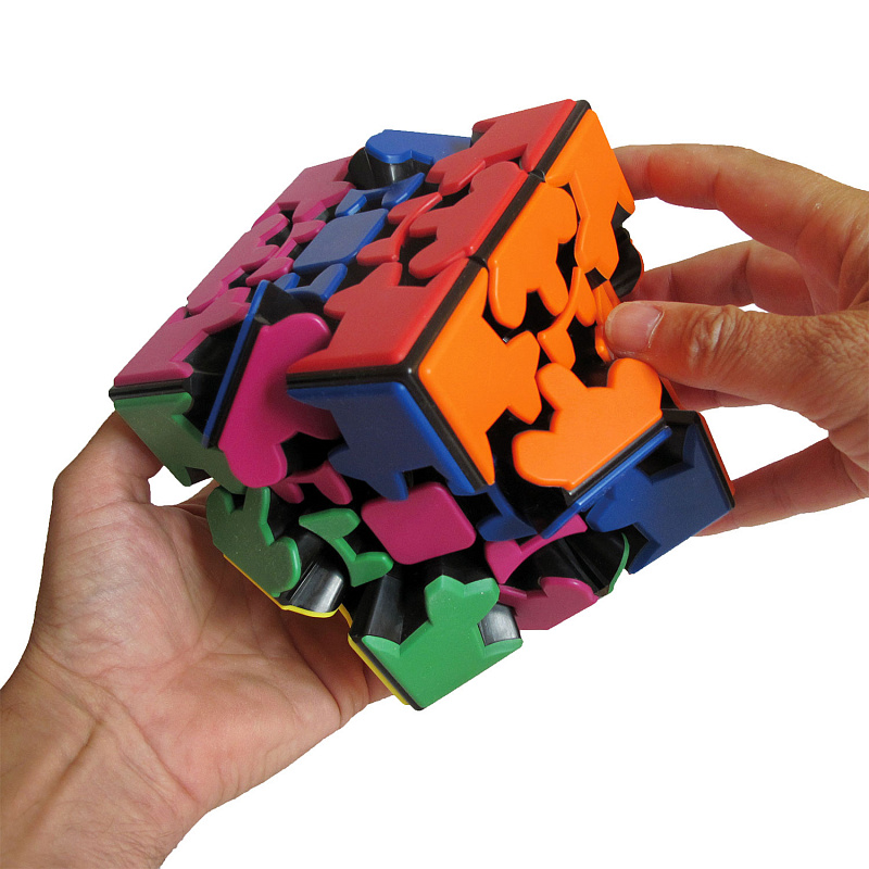 Подарочная головоломка размером 12см (!) на деревянной мини-паллете. Без наклеек: вместо них здесь цветные пластиковые плитки, красивые и долговечные. Весь механизм, все шестеренки расположены на виду, что придает кубу крайне загадочный вид. Безусловно, головоломка напоминает кубик Рубика, хотя по сложности она значительно проще. Шестеренки вносят свой вклад в особенности сборки. Тут потребуется целых 12 поворотов на 90º, чтобы провернуть весь кубик и вернуться в изначальное состояние. В целом же, большинство поворотов этой головоломки потребуют вращения на 180°. Привычные по кубику Рубика повороты на 90º будут приводить Gear Cube в промежуточное состояние, не позволяющее вращать головоломку в других плоскостях. Для продолжения сборки потребуется завершить полный 180° поворот в выбранной плоскости.