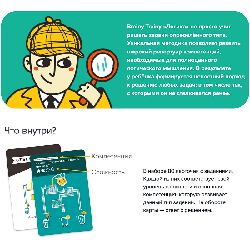 Brainy Trainy «Логика» не просто учит решать задачи определенного типа, а развивает способности, необходимые для полноценного логического мышления. В результате у ребёнка формируется целостный подход к решению любых задач: в том числе совершенно незнакомых, с которыми он не сталкивался ранее.