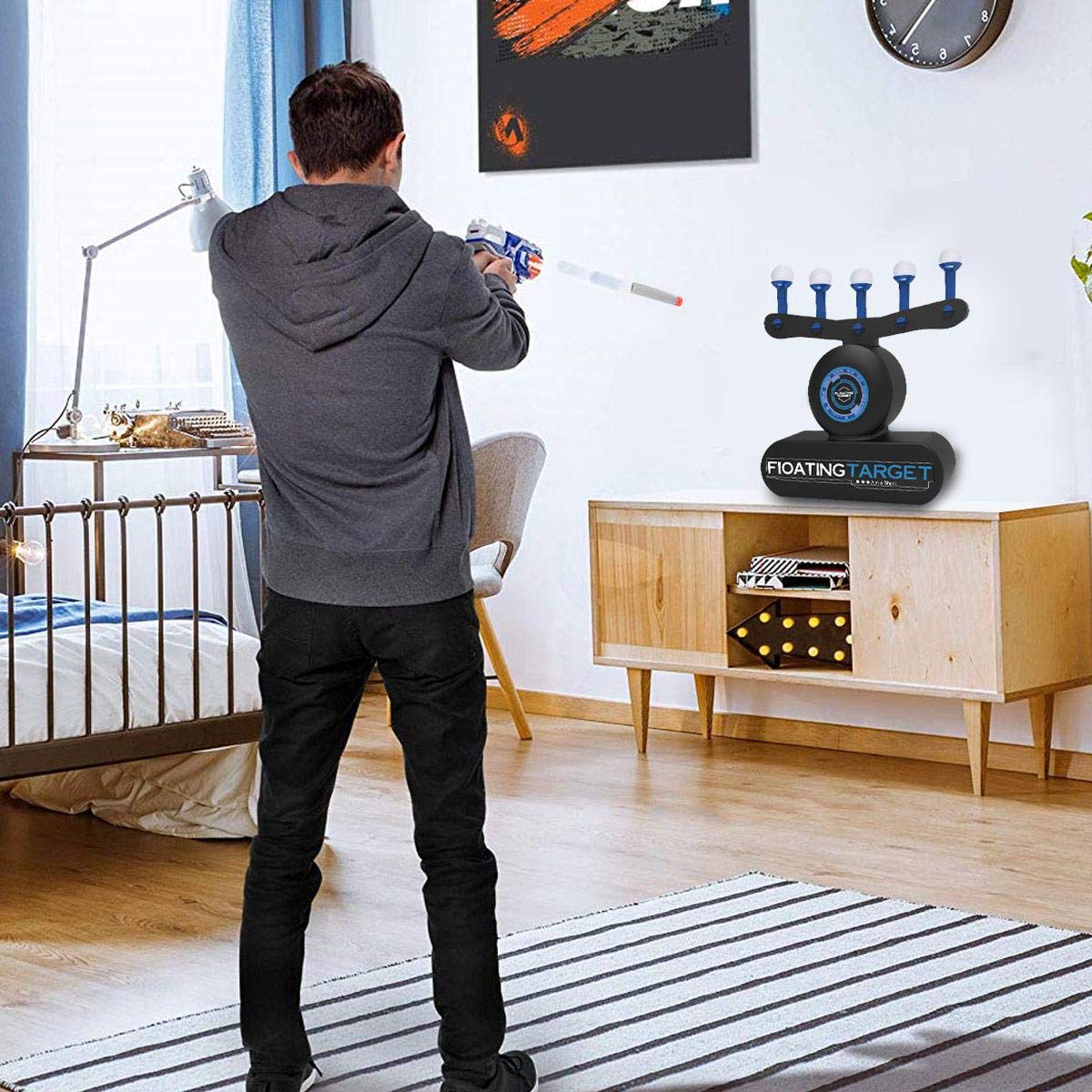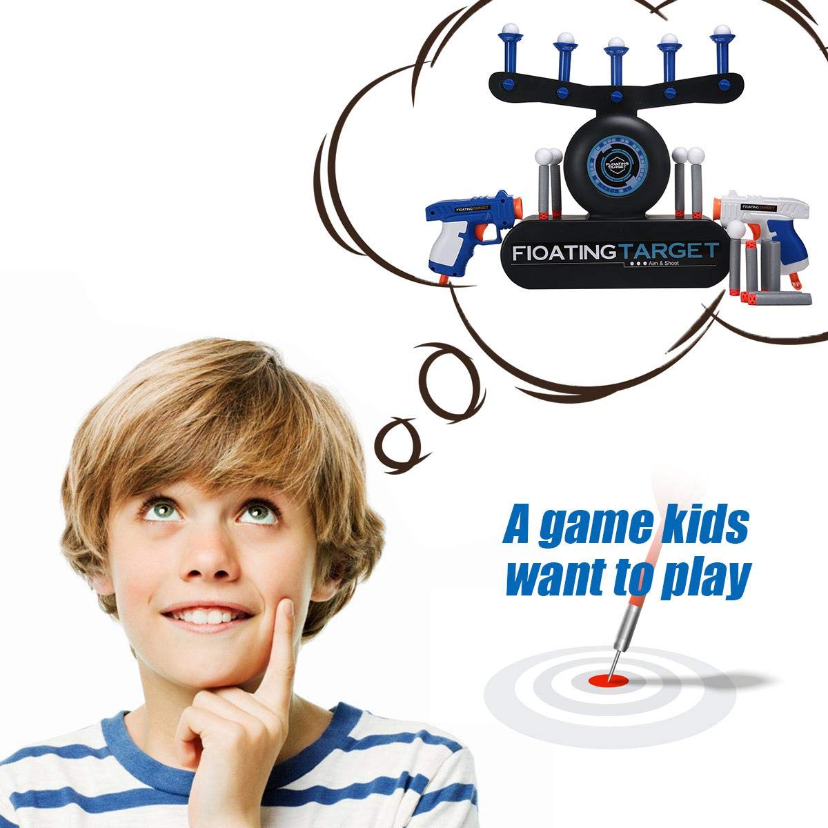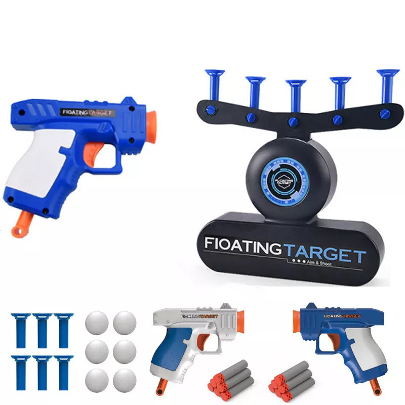 Включите вентилятор и аккуратно поместите один из шариков из пенопласта над каждым из пяти вихрей. Как по волшебству, они мгновенно начинают зависать в воздухе. Интересное зрелище! Но веселье на этом еще не заканчивается. Возьмите пистолет и загрузите в него один из пяти включенных пенных дротиков. Потяните петлю, чтобы взвести ее, целитесь с помощью встроенных прицелов, сделайте глубокий вдох и... ОГОНЬ! У вас есть навыки, чтобы выбить все пенопластовые шарики одним выстрелом? Вперед тренироваться! Захватывающий, сложный и веселый, независимо от того, на каком вы уровне мастерства, Hover Shot — это невероятное приключение для стрелков всех возрастов. 1. Новый вид игры для стрельбы, поместите мяч на воздушную подушку, поверните кнопку, чтобы контролировать поток воздуха, измените высоту мяча, увеличьте сложность, и позвольте детям насладиться веселой и необычной игрой. Игра помогает развить у ребенка много способностей — поможет улучшить зрительное пространство и развить координацию рук и глаз. А также поможет улучшить концентрацию внимания. Работает от 4-х АА батареек (батарейки не входят в комплект), так и от сети при помощи USB кабеля ( входит в комплект).