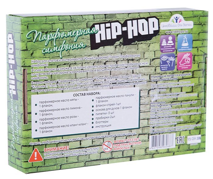 С этим необычным набором для опытов и экспериментов ребята смогут не только изучить основы профессии парфюмера, но и создать уникальные духи, аромат которых будет подчеркивать индивидуальность и стиль его обладателя. Входящие в состав набора компоненты позволят создать парфюмерную симфонию Hip-Hop, подходящую девочкам, увлекающимся одноименным направлением музыки.
