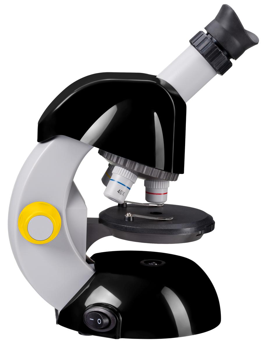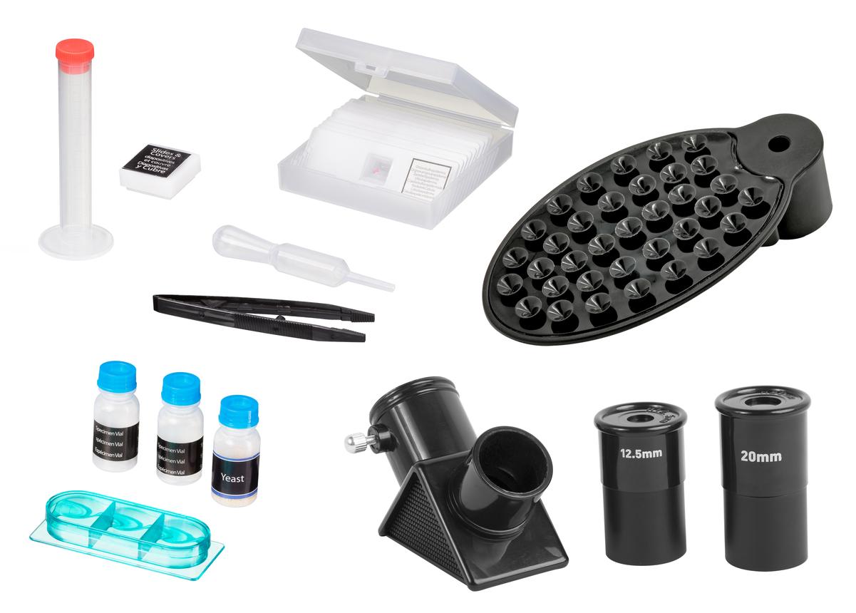 Микроскоп Объективы микроскопа: 3 шт. Зум-окуляр микроскопа: 1 шт. Инкубаторий: 1 шт. Слайды подготовленные: 3 шт. Предметные стекла: 9 шт Покрывные стёкла: 10 шт. Набор аксессуаров для препарирования Баночка с дрожжами: 1 шт Баночки для образцов: 5 шт.