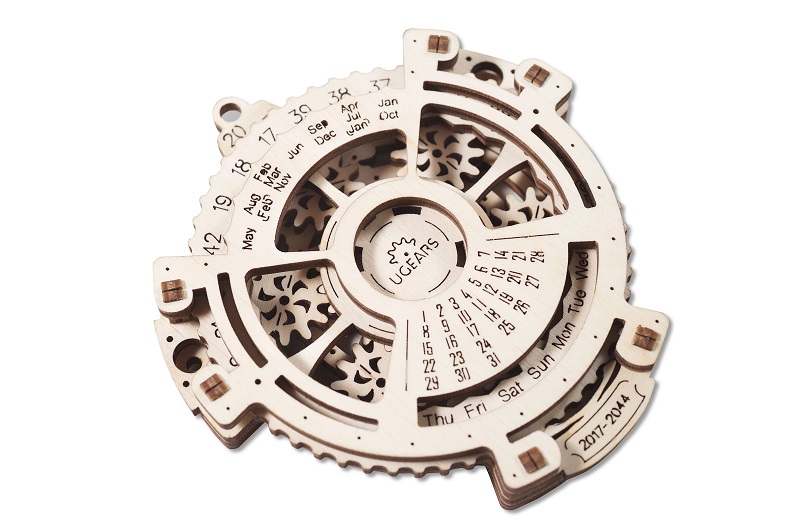 Модель «Навигатор дат» от Ugears — интересный механический календарь на 2017−2044 годы с планетарным стимпанк механизмом с подвижными шестернями внутри. К тому же, онприятно пахнет деревом. Покрутите кольцо с текущим годом в основе навигатора, сопоставьте нужный вам год и месяц и узнайте: на какой день недели (понедельник, вторник.... воскресенье) приходится каждый день месяца.