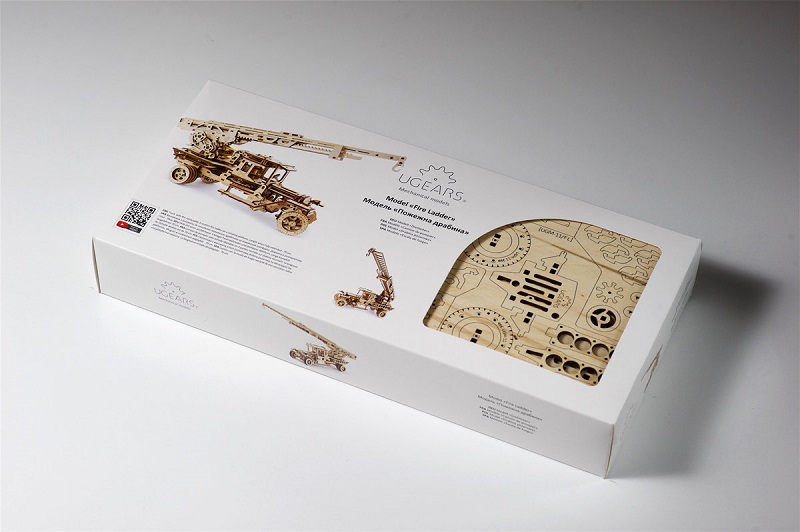 Пожарная лестница UGEARS работает на резиномоторе, имеет работающую подвеску, переднюю и заднюю передачу, а также нейтраль, под откидывающимся капотом капотом реалистично молотят 4 поршня, а за открывающимися дверями кабины полностью функционирующее рулевое колесо и педаль газа! На поворотной платформе установлена с выдвижная 3-секционная пожарная лестница, которая трансформируется в подъемный кран. Длина лестницы в раздвинутом состоянии — 70 см. Лестница имеет несколько элементов управления: с помощью специального вентиля лестница складывается и раскладывается; основание лестницы поворачивается вправо и влево с помощью ручки; нажав несколько раз на рычаг, можно поднять лестницу вверх или опустить, а специальный храповик зафиксирует выбранное положение. На краю лестницы есть крючок, чтобы использовать её в качестве подъемного крана. Как и в большом прототипе, в пожарной машине UGEARS есть дополнительная маленькая приставная лесенка. Лесенка цепляется на основу большой лестницы, чтобы было проще подняться наверх.