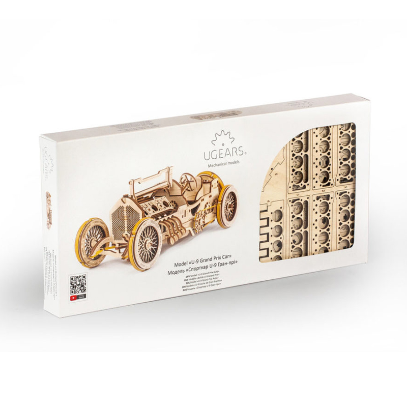 Созданный из качественной фанеры, спорткар U-9 Гран-при собирается без клея и специальных инструментов. Когда вы впервые открываете коробку, первое, что отмечаете, это приятный запах дерева. Это экологично и здорово. Внутри упаковки вы найдете фанерные доски, из которых нужно просто выдавить готовые детали и трансформировать их в готовую модель. Несколько способов соединения деталей, которые используются в спорткаре Ugears, являются изобретением и защищены международными патентами. Собирается модели по пошаговой иллюстрированной инструкции с пояснениями на 10 языках. Компактная модель имеет небольшой вес, поэтому ее легко можно брать с собой на вечеринки с друзьями — если вы решите устроить настоящие гонки ретро-автомобилей.