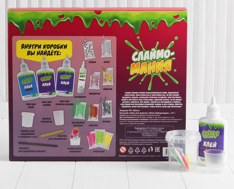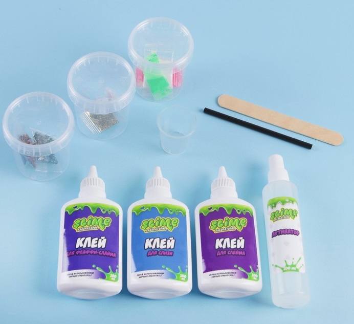 В наборе: инструкция, флакон с клеем для слайма, флакон с клеем для слизи, флакон с клеем для флаффи-слайма, флакон с активатором, три емкости для смешивания, мерный стаканчик, трубочка для пузырей, палочка для размешивания, три красителя (розовый, зеленый, желтый), магнитный порошок и магнит, светящийся порошок, серебряные блестки, ароматизатор «Кола», пенопластовые шарики, пластиковые глазки.
