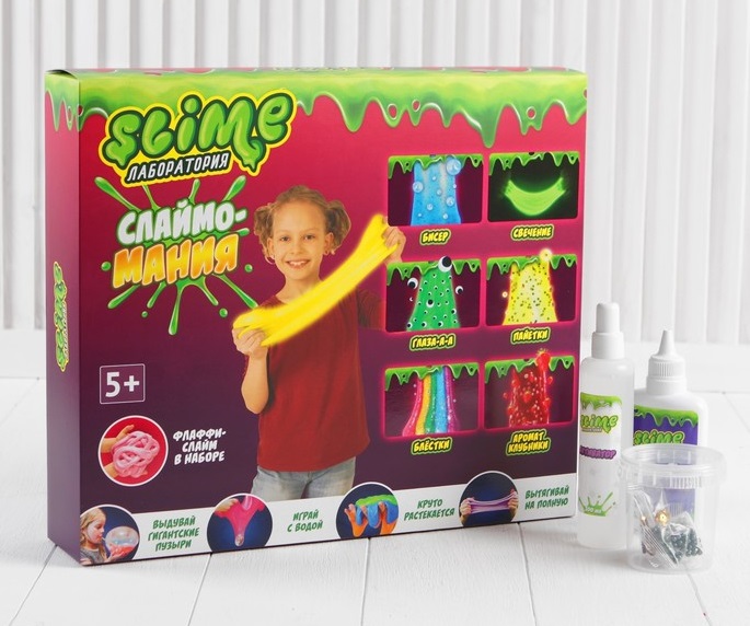 Можно сделать три вида слайма: стандартный, флаффи и слизь. Можно сделать разноцветный слайм. Можно сделать слайм с разными свойствами. Готовый слайм удобно хранить в герметичных контейнерах.