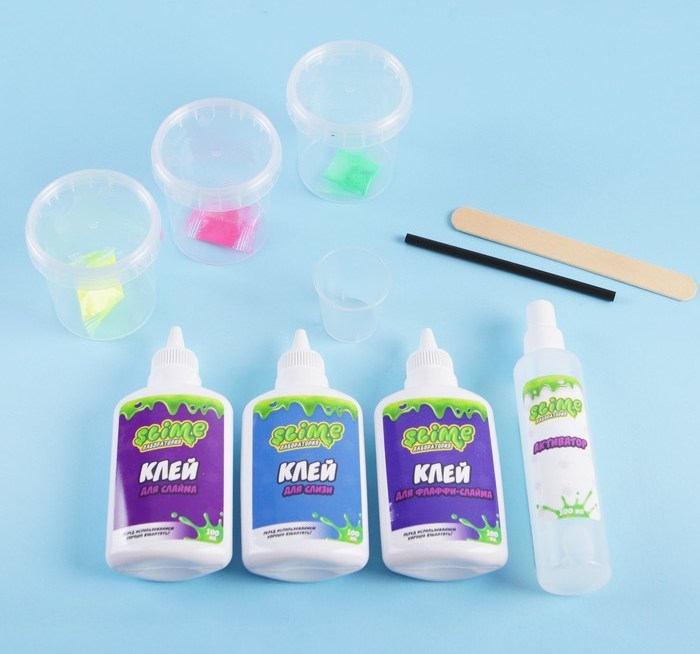 Набор позволит юным исследователям организовать в домашних условиях собственную лабораторию, в которой будут производиться лизуны 3-х разных видов: жидкий как вода (слизь), сверхэластичный супер-слайм, матовый и нежный флаффи-слайм.