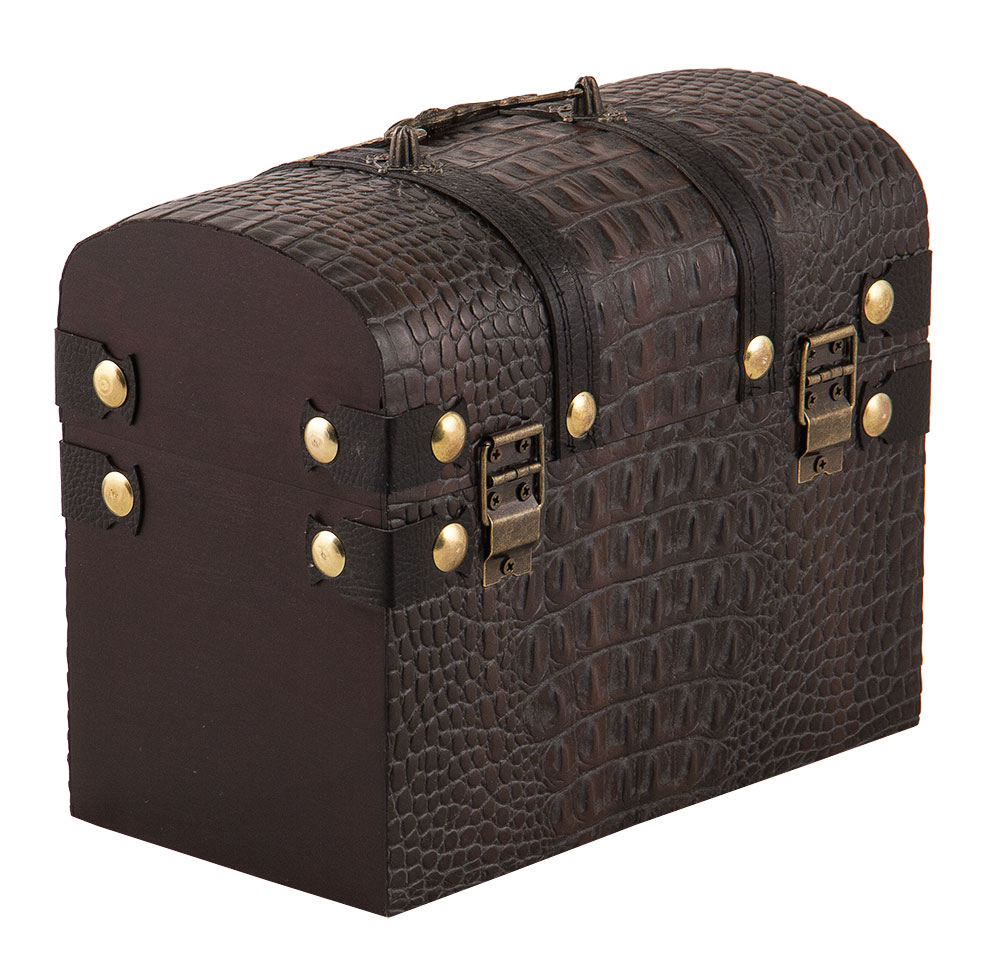 Материал: дерево, натуральная кожа, золотое тиснение, латунная фурнитура. Размер сундучка: 190 × 100 × 160 мм.
