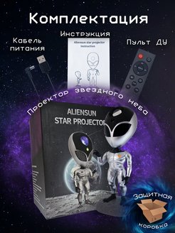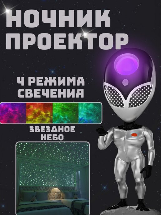 Уникальный лазерный ночник проектор звёздного неба «Инопланетянин» — это — отличный декор комнаты, — интересная для ребёнка фигурка игрушка, — мощный светильник проекция космических туманностей и звездного неба, — ночник с подсветкой глаз, — «повторюшка»: в режиме голоса он записывает вашу речь и повторяет ее. Домашний лазерный проектор мощнее обычных светодиодных проекторов, а значит изображение, исходящее из головы нашего «Инопланетянина» будет ярче, чётче, мощнее. Регулируйте положение головы пришельца и направляйте свет, куда вам нужно, все настраивается под ваши предпочтения. Проекция космической туманности и звёзд управляется как с пульта, так и с кнопок на самом светильнике звёздного неба. Вы сами устанавливаете яркость, скорость движения, динамическое или статическое движение. В комплекте идёт пульт, который позволяет вам управлять RGB проектором «Инопланетянин» не вставая с места, что очень удобно, если вы хотите поменять режимы. Лазерный звёздный проектор служит также ночником. Вы можете оставить включёнными только глаза Инопланетянина, которые мягко будут подсвечиваться в темноте. Спать вы будете под защитой вашего маленького друга. Уникальный дизайн проектора подойдёт как комнате ребёнка, подростка, так и комнате взрослого человека, интересующегося фантастикой или просто вдохновленного необычной формой светильника. Поверьте, ваши гости с восторгом будут спрашивать, что же стоит у вас на полке! Таймер отключения будет удобен, если вы хотите уснуть в окружении космических туманностей. Установите время на 1 час или на 2 часа, и Инопланетянин сам отключится. Весёлая функция управления голосом. Включите эту функцию, и Инопланетянин будет повторять любые звуки, которые вы произносите. Появляется ощущение, что маленький пришелец разговаривает с вами. Отзывы покупателей доказывают, что такой светильник всегда будет в центре внимания на вашей вечеринке, украсит уютный вечер за просмотром фильма, восхитит детей и взрослых, станет весёлым ночником, забавой с повторением голоса, будет отличным фоном ваших видео и фото. Равнодушных нет! Внимание! Ознакомьтесь с инструкцией в коробке, чтобы обеспечить правильное безопасное использование лазерного проектора звёздного неба.