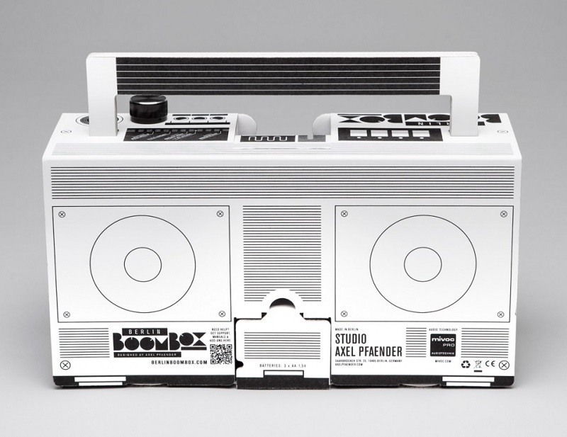 Аудиоцентр Berlin Boombox разработан берлинским дизайнером Акселем Пфэендером. Эстетика прямоугольных моделей старой школы ghetto blasters — переносного аудиоцентра популярного в 1980-х годах и в России более известного как бумбокс, стала источником вдохновения и энтузиазма немецкого дизайнера.