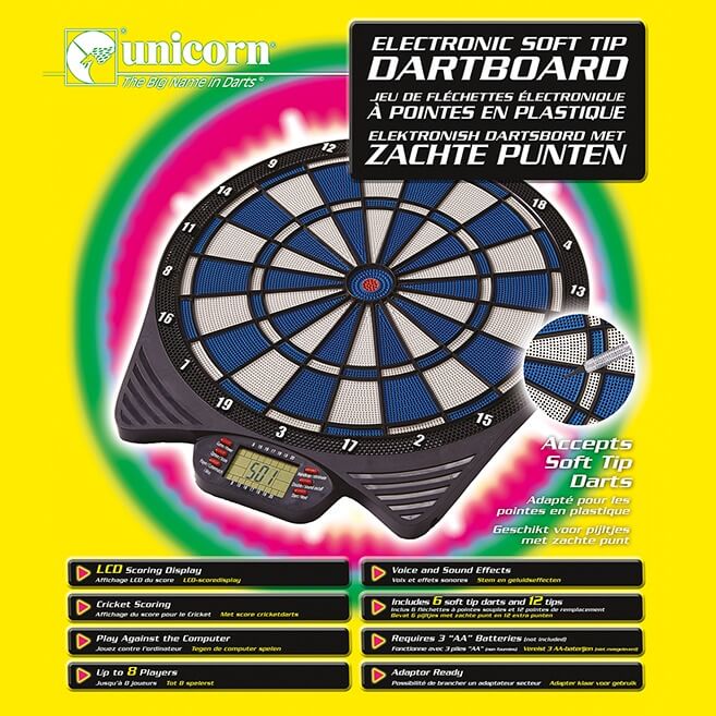 - Особенностью этого дартс являются пластиковые дротики, благодаря которым ваш офис или дом совершенно не пострадают! Они не имеют острого наконечника и не могут никуда воткнуться кроме дартса. Дротики (6 шт.) предназначены специально для игры в электронный дартс. Игла сделана из пластика, что делает игру еще более безопасной как для детей, так и для взрослых.*7 запасных игл-наконечников, сделанных из пластика.Инструкция по игре в дартс.Питание от 3-х батареек АА (в комплект не входят).*Мишень содержит: LCD-дисплей, 21 игра, 110 вариантов игр, до 8-ми игроков, звуковые и голосовые эффекты..