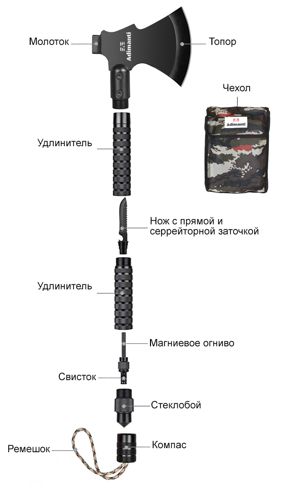Топор Adimanti AXE-003 является мультифункциональным изделием, состоящим из нескольких полезных инструментов: