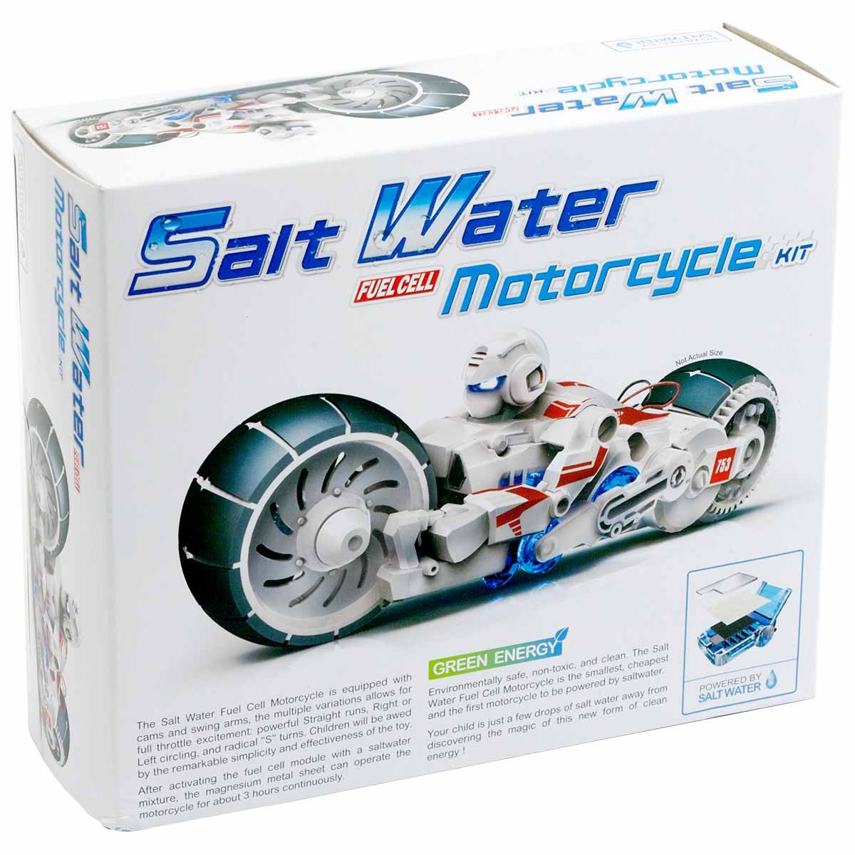 Данное устройство основано на принципах работы высокоэкологического «чистого» двигателя. Набор обучит Ваших детей основам понятия новых форм экологически чистой энергии. Вы будете поражены, что просто добавив несколько капель соленой воды, двигатель мотоцикла начнет работать. Совсем немного времени нужно нашим современным дизайнерам, чтобы такие мотоциклы, уже во взрослом варианте, ездили по нашим дорогам, не загрязняя атмосферы. Соленая вода — и ничего больше! Мотоцикл необходимо собрать из отдельных элементов, положить в определенной последовательности магниевую пластину и катод, добавить пару капель солёной воды. В топливный модуль вставляется лист металлического магния. При попадании на него соленой воды происходит реакция, и выделяемая при этом энергия несет этот легкий и подвижный мотоцикл вперед по плоской поверхности. Промыть лист водой обычной — и мотоцикл встанет без движения. Подарите такой конструктор Вашему ребенку и быть может, он прокатит Вас в будущем на своем мотоцикле, устроенном по тому же принципу.