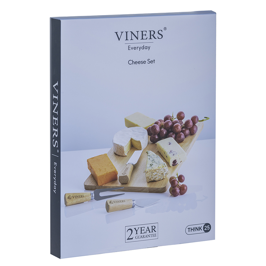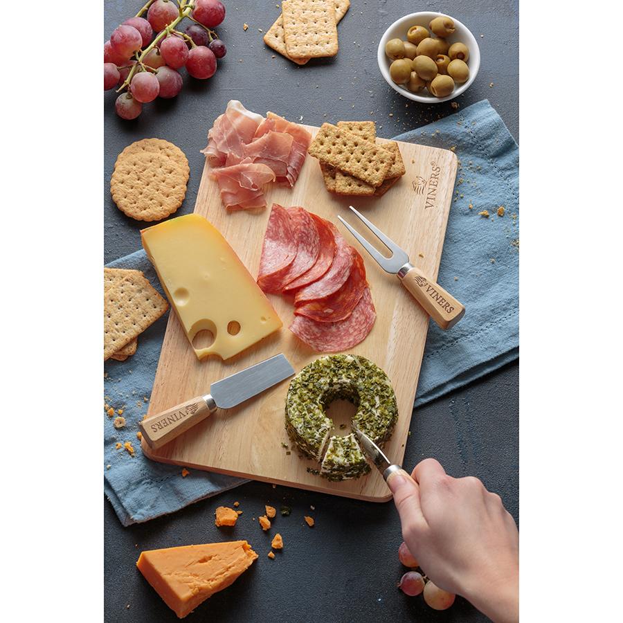 В комплект входят деревянная сервировочная доска 20 х 30 см, а также нож для жесткого сыра, нож для мягкого сыра и специальная вилка с двумя зубьями, выполненные из нержавеющей стали и оснащенные эргономичными деревянными ручками. Набор поставляется в подарочной упаковке.