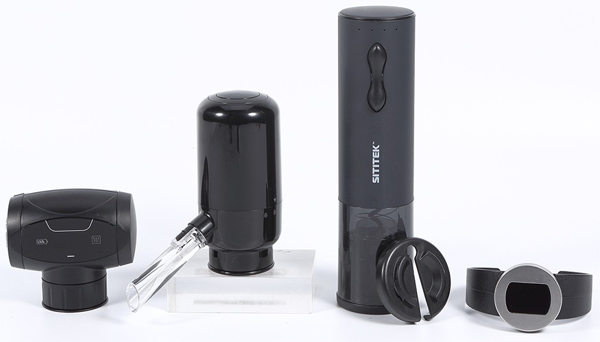 Преимущества винного набора «SITITEK E-Wine Black Edition»: 5 полезных инструментов в одном наборе. Предлагаемый комплект включает простой в применении электрический штопор, аэратор-помпу для автоматического розлива вина и одновременного насыщения его кислородом, электронную вакуумную пробку для закупоривания бутылок, универсальный цифровой термометр, измеряющий температуру напитков даже в закупоренной таре, а также нож для срезания фольги.