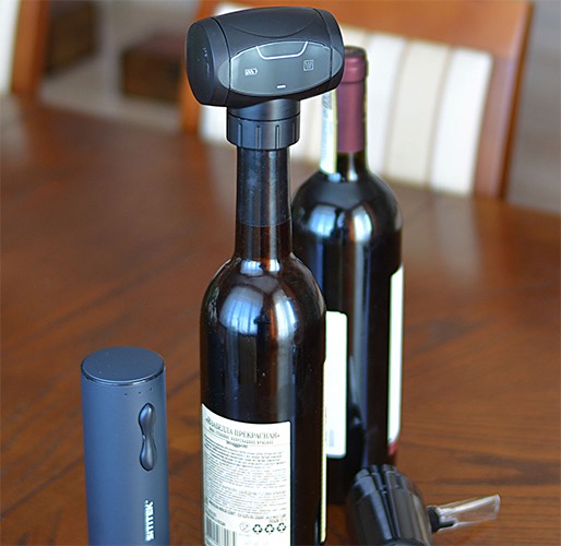 Электронный аэратор-помпа для розлива и аэрации вина. Делает процедуру дегустации вин максимально комфортной. Благодаря удобному носику у вас нет ни единого шанса пролить вино, ведь вам даже не нужно наклонять бутылку. Аэрация происходит мгновенно, в процессе розлива в бокалы. Компактный насос осуществляет перекачку вина из бутылки в подставленную вами емкость. В саму бутылку погружается длинный стержень, полый внутри. Для начала процесса аэрации и розлива сдвиньте переключатель на носике в положение «ON» и нажмите кнопку на верхнем торце устройства. Электронная вакуумная пробка для бутылок. Автоматически откачивает из откупоренной бутылки с вином воздух, чтобы оставшийся напиток дольше оставался свежим. Вакуумная пробка будет контролировать давление воздуха внутри бутылки и при необходимости запускать процесс откачки воздуха. Прибор оснащен датчиком опрокидывания с целью предотвращения разлива вина. Когда винная бутылка наклоняется до 45°, процесс откачивания воздуха прекращается, а при возвращении вертикального положения — возобновляется. Универсальный цифровой термометр-браслет. С его помощью вы сможете измерять температуру напитка даже в полностью закрытых бутылках в очень широком диапазоне — от -9 до +70 °C. Термометр легко зафиксировать на любой бутылке диаметром до 8 см, он полностью автономен, так как питается от батарейки.