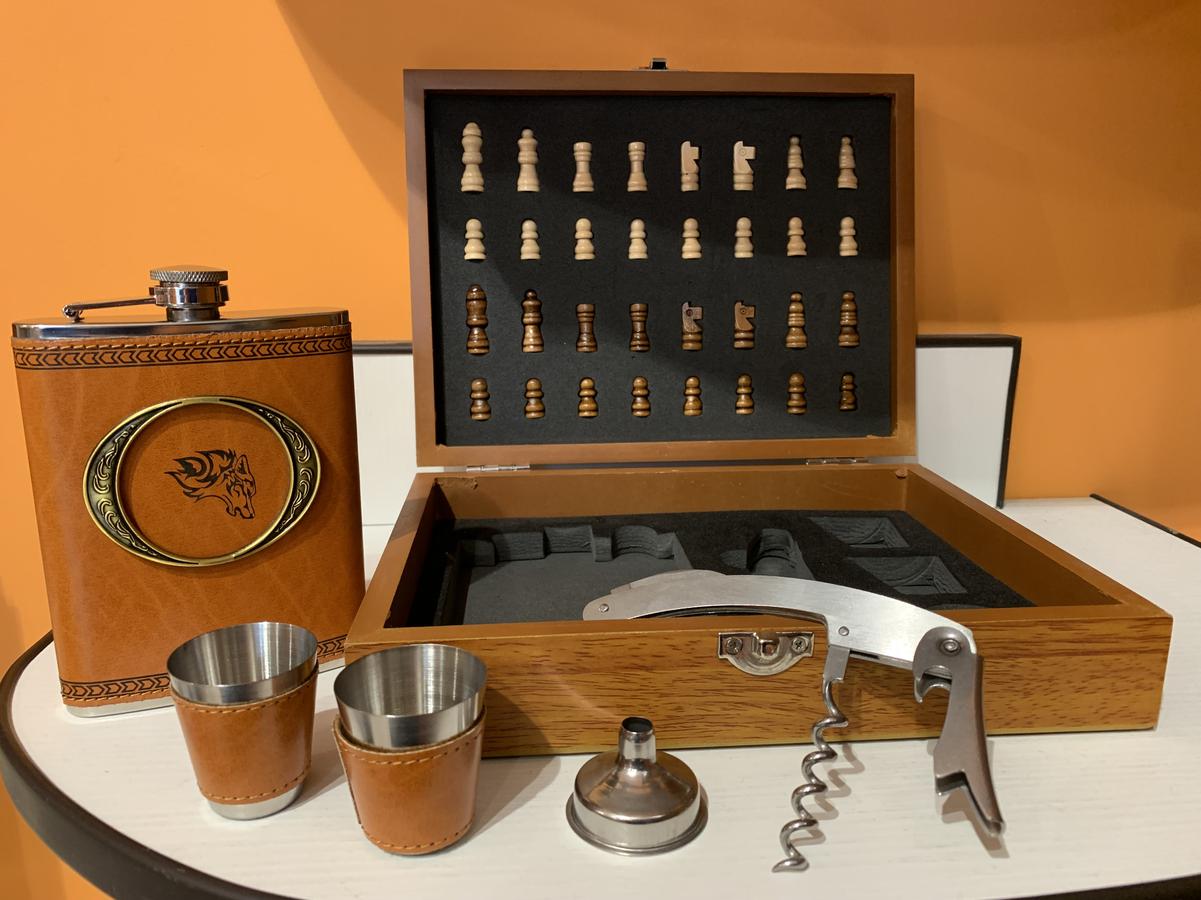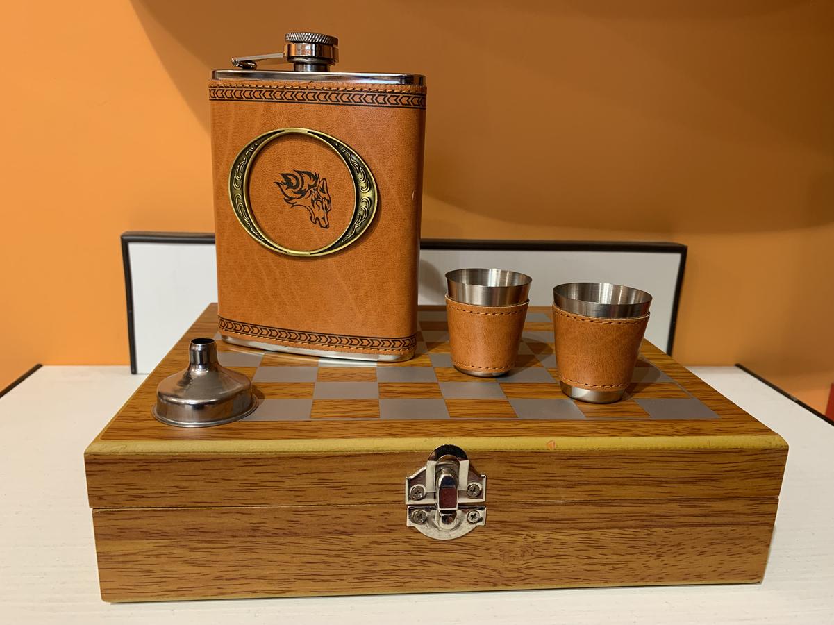 Мужской подарочный набор с фляжкой и... шахматами! Набор упакован в шахматной доске из дерева, внутри фигурки для игры в шахматы. Фляжка объемом 232мл, два металлических стаканчика, объемом 30мл., раскладной нож со штопором, воронка для фляжки.