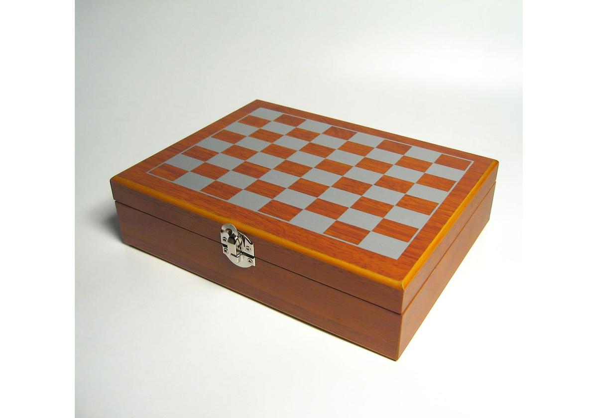 Набор упакован в шахматной доске из дерева, внутри фигурки для игры в шахматы.