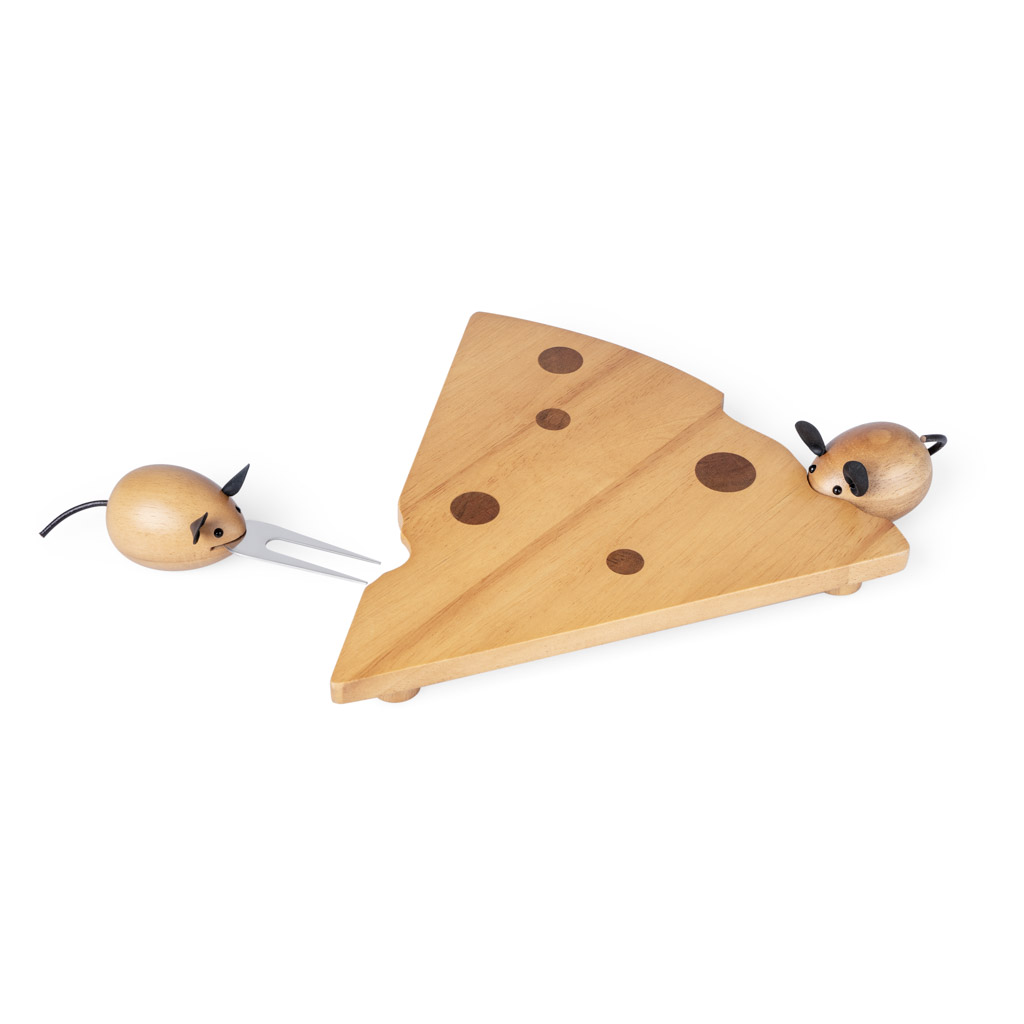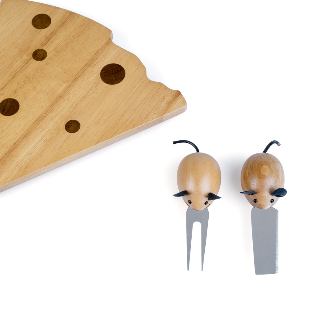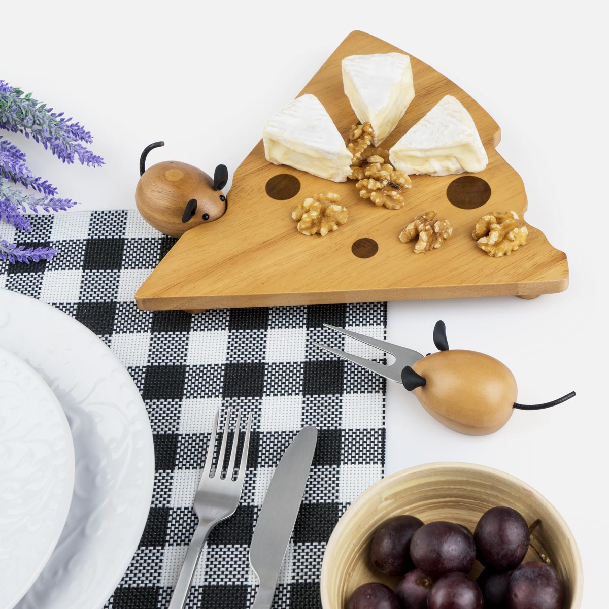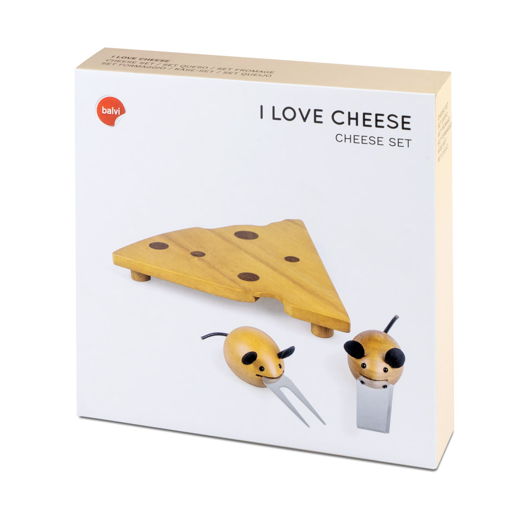 Нарезка и подача сыра — настоящее искусство. Для таких случаев испанский бренд Balvi создал оригинальный набор аксессуаров для сыра — I Love Cheese. В набор включены деревянная доска в виде кусочка сыра, специальная металлическая вилка и нож, с помощью которых любой сыр может быть нарезан быстро и очень красиво. Оригинальный дизайн позволяет использовать доску также в качестве подноса для подачи нарезанного сыра. Смотрится такая сервировка очень стильно и необычно. В корпусе доски расположены несколько магнитов, с помощью которых удерживаются ножи для резки. Ручки ножей сделаны в форме мышек, что смотрится очень необычно.