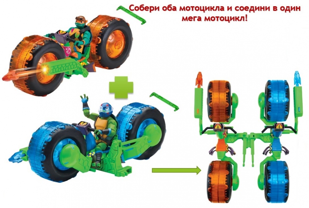 Описание Мотоцикл Черепашки-ниндзя с эксклюзивной фигуркой Лео серия ROTMNT — Эволюция Черепашек-ниндзя. Можно соединить 2 мотоцикла в один Мега мотоцикл. Игрушка имеет интересный дизайн. У фигурки все части тела подвижные. Ноги сгибаются на шарнирах. Метательная стрела и съемный механизм для метания. При нажатии на кнопку стрела вылетает в противника Мотоциклы могут состыковываться между собой, при стыковке 2-х ниндзя-циклов, получается 4-х колесный мотоцикл, при стыковке между собой 4-х ниндзя-циклов, получает большой 8-ми колесный мотоцикл. Также мотоцикл имеет механизм крепления к ниндзя-танку с функцией запуска. Мотоцикл оснащён специальным механизмом, который позволяет играть с ниндзя-циклом в 2-х режимах, верхнем и нижнем.