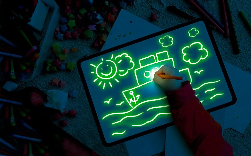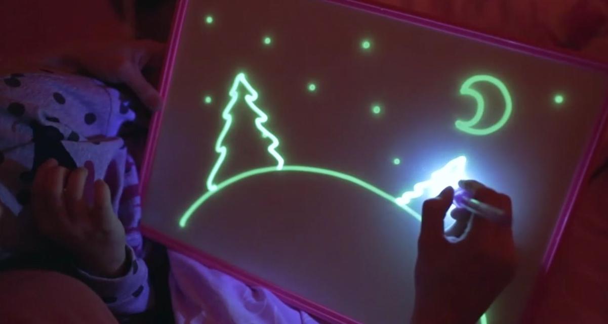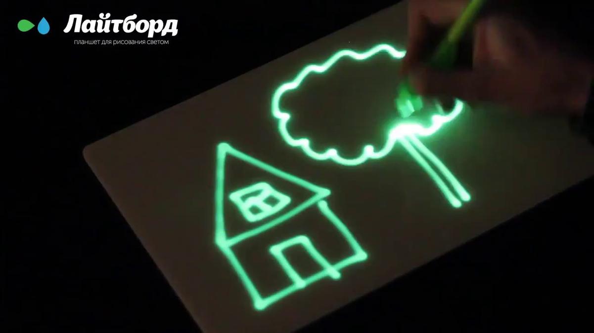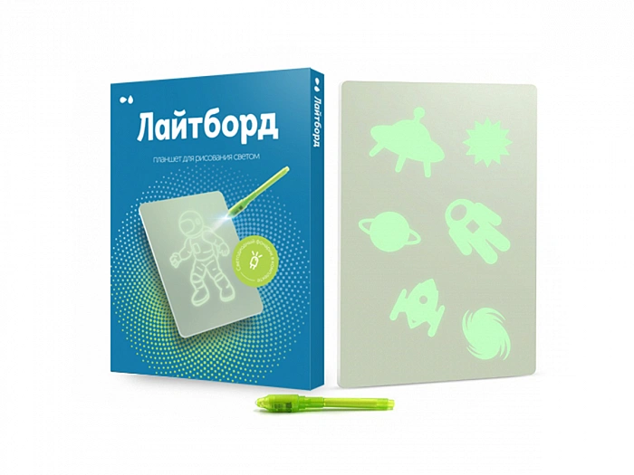 Можно рисовать картины или светящиеся послания; Детям очень понравится сказка, рассказанная при помощи Лайтборда; Можно использовать даже как ночник; Любой рисунок исчезнет в течение 20 минут; Чем темнее в помещении, тем ярче светится рисунок. В комплект входит: