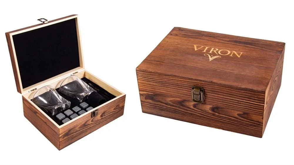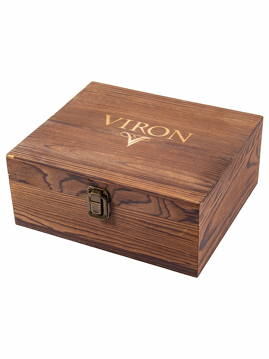 Торговая марка Viron представляет эффектный набор для алкоголя. В кейсе из натурального дерева находятся предметы, которые предназначены для наслаждения крепкими алкогольными напитками: виски, бурбоном, коньяком, бренди и другими. В стильный кейс входят два стеклянных бокала «олд фешен» круглой формы и восемь кубиков из природного гранита. Гранитные камни предназначены для сохранения оригинального вкуса и аромата алкогольных напитков. В отличие ото льда, который постепенно тает и разбавляет водой алкоголь, камни способны поддерживать оптимальную температуру благородного алкогольного напитка до 17–18 °С на протяжении долгого времени. Перед подачей нужно охладить камни в морозильной камере на протяжении 2-ух часов.