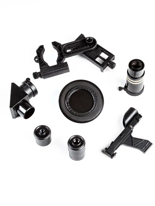 Комплектация: телескоп, 2 окуляра: 20 мм / 6 мм, диагональное зеркало, искатель, линза Барлоу 3х, штатив, солнечный фильтр, адаптер для смартфона