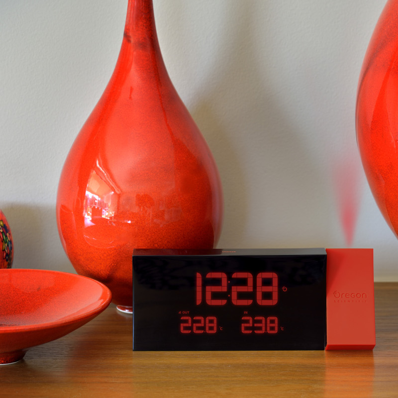 Эти элегантные часы (модель RMR221PN — red) способны отображать показания комнатной и уличной температуры, текущие дату и время, а также выполнять функцию будильника.