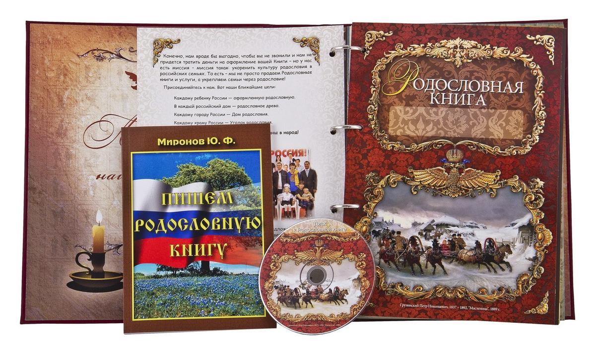 внутренний художественный блок листов (60 бланков для заполнения Персональных листов, 12 календарных памятных дат, 12 указателей родов); методическое пособие по ведению родословной книги в виде брошюры; удобный кольцевой механизм для изменения и добавления листов; компакт диск (CD) с шаблонами для самостоятельного заполнения персональных листов, с генеалогическими программами для составления родословных древ и электронной 3D демо версией родословной книги; подарочная коробка из плотного картона бордового цвета; подарочный пакет с надписью «Родословная книга». К каждой книге прилагается: