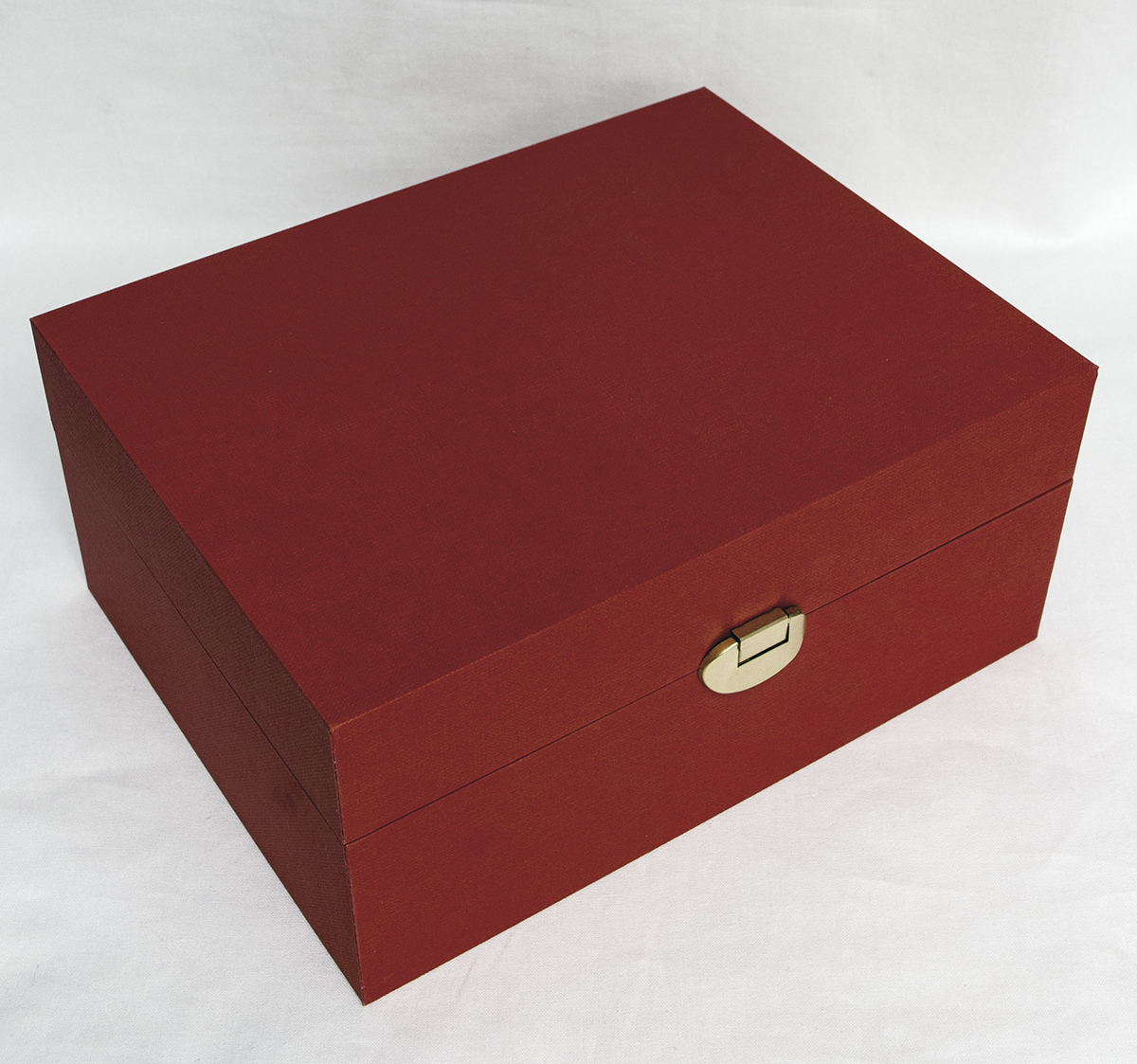 Размер футляра: 24 × 18 × 10,5 см. Материал футляра: дерево, дизайнерская бумага красного цвета, латунная фурнитура «Автомат».
