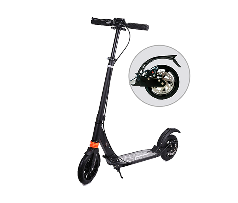 Описание Складной городской самокат Urban Scooter с ручным дисковым тормозом и 2-мя амортизаторами — это идеальная модель для взрослых и детей от 7 лет. В этом самокате есть всё необходимое для комфортного и безопасного катания. Ручной дисковый тормоз позволяет эффективно тормозить даже на высокой скорости. И это действительно полезная опция, особенно для любителей погонять. Всё благодаря тому, что большие полиуретановые колёса диаметром 200 мм в сочетании с высокоточными подшипниками класса ABEC-7 способствуют лёгкому разгону и обеспечивают хороший накат. Вдобавок ко всему оба колеса оснащены амортизаторами, которые снимают вибрации при катании по неровной поверхности, например, по плитке, брусчатке или криво уложенному асфальту. Поэтому гонщик не ощущает тряски, катаясь на этом ультрасовременном самокате с большими колёсами. Широкая платформа позволяет поставить обе ноги после разгона обеспечивая большую стабильность в удержании равновесия.При небольшом весе, всего 5.6 кг, самокат выдерживает нагрузку до 100 кг, а высота рулевой ручки регулируется в нескольких положения. Поэтому самокат практически не имеет возрастных ограничений. Самокат легко складывается пополам,что делает его очень мобильным и удобным для транспортировки. В сложенном виде самокат очень компактен и с ним можно беспрепятственно перемещаться в общественном транспорте. Кроме того, ручки у руля съёмные. Их можно легко и быстро снять и поставить. Также, на рулевой штанге есть держатели для ручек, на случай, когда нужно их сложить для транспортировки. Самокат продаётся полностью собранным и готовым к использованию сразу из коробки. Вам нужно только отрегулировать высоту руля и вставить ручки. Минимум регулировки и Ваш самокат готов к выезду на улицы города.