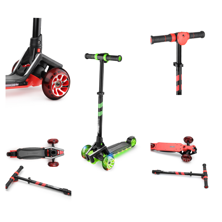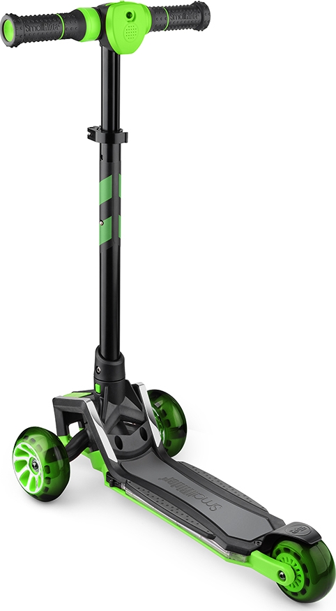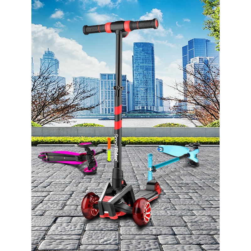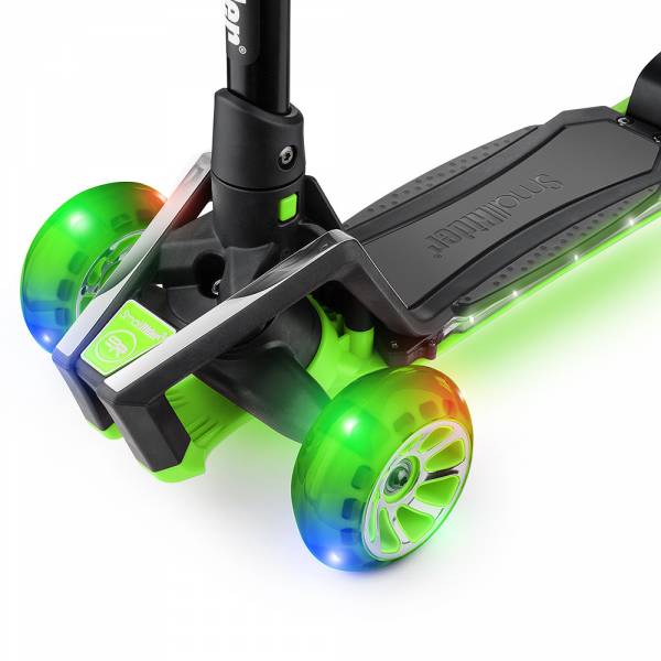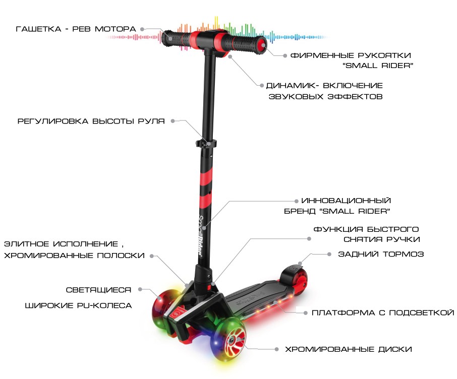 Детский трёхколёсный самокат Small Rider Premium Pro (Смолл Райдер Премиум Про ) со съёмной регулируемой ручкой, звуковым эффектом имитирующим рёв мотора, подсветкой платформы и широкими светящимися колёсами 120/100 мм. Для детей от 3 до 8 лет. Сверхпрочный и неубиваемый. Особенности Премиальный супер-стильный дизайн. Самокат выглядит очень круто, и ассоциируется скорее с космическим кораблём. Спереди имеются хромированные алюминиевые полосы с фирменным логотипом. Специальный звуковой эффект, который при кручении ручки издаёт звук ревущего мотора. Работает от 2 пальчиковых батареек АА, которые вставляются в звуковой модуль. Включается и выключается при помощи кнопки. После включения поверните гашетку акселератора, чтобы самокат заревел, как настоящий мотоцикл. Такая «фишка» произведёт эффект на всех сверстников. Широкие светящиеся колёса выглядят очень эффектно. При этом, поверхности касается только их центральная часть, что повышает манёвренность самоката. Диаметр передних колёс — 120 мм, ширина — 50 мм. Широкие колёса очень практичны особенно при катании по брусчатке, когда есть риск попадания колёс между плитками. Premium Pro с лёгкостью преодолеет такие препятствия. Хромированные вставки на колёсных дисках. Подсветка платформы. При катании в вечернее время можно включить подсветку платформы. В таком режиме самокат как-будто плывёт в темноте, как светлячок. Подсветка включается при помощи кнопки расположенной под платформой. Функция лёгкого снятия ручки. Ручка отстёгивается одним движением при нажатии на кнопку в её основании. Нажали, потянули — всё! В разобранном виде самокат очень компактен, как для переноски, так и для хранения. Элитный механизм поворотов позволит выполнять крутые виражи и при этом сохранять равновесие. Повороты влево-вправо осуществляются при помощи наклона ручки в соответствующую сторону. Ручка регулируется по высоте в нескольких положениях, что позволит ребёнку кататься на самокате начиная с 3-х и до 8 лет. Просто регулируйте высоту по мере роста.